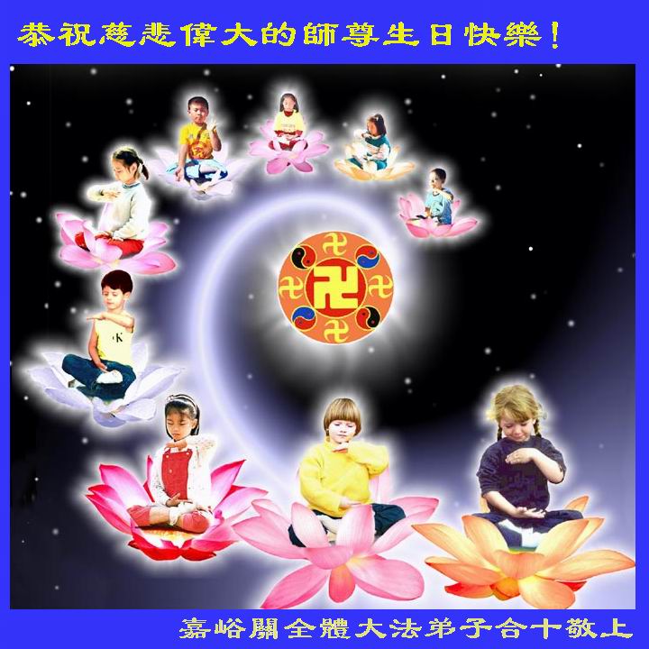 看似平凡不平凡 万王之王在人间 转动法轮乾坤正 祛邪除魔法无边 大法弟子千千万 助师正法莫等闲 救度众生为己任 完成使命方圆满 兑现誓约号第一 香满天庭亿净莲 大法众徒谢师恩 旷宇穹苍换新颜 被非法关押在长春第三看守所、长春朝阳沟劳教所全体大法弟子、长春黑嘴子女子监狱的全体大法弟子恭祝师尊生日快乐!