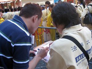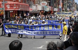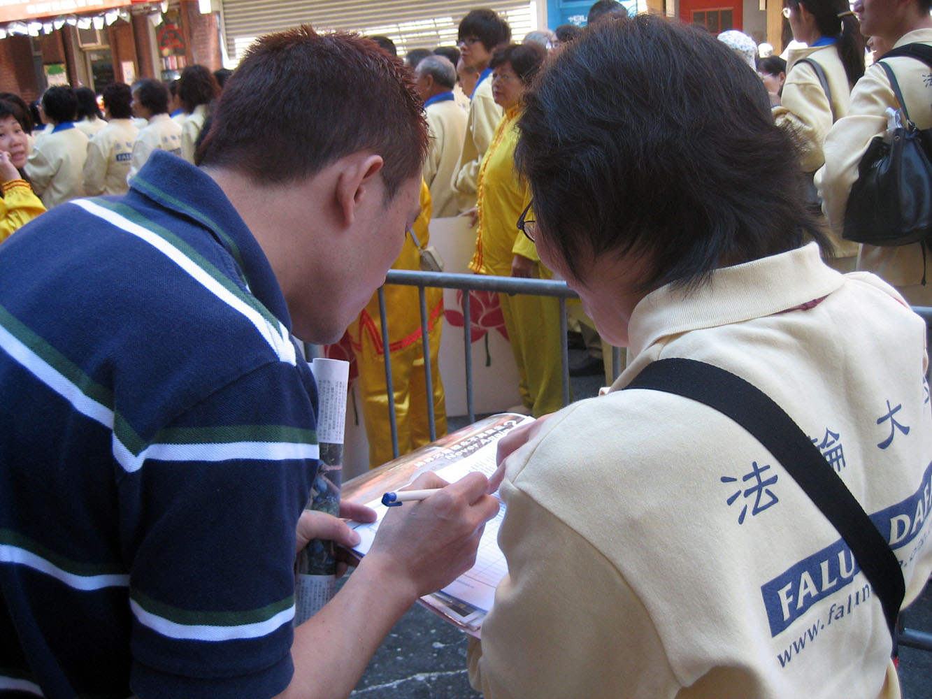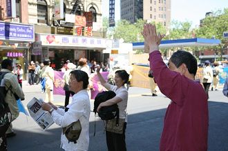 在天国乐团振奋人心的乐曲前导下,大型的“法轮大法”、“真善忍”横幅,和已翻译成多种语言的《转法轮》模型、法轮大法洪传世界八十余国的展板,伴随着法轮功学员平静祥和的炼功方阵,展示了法轮功的美好;捧着被迫害致死法轮功学员遗照的肃穆白衣队伍和一幅幅惨不忍睹的受迫害照片,及“你想过吗?为何信仰真善忍遭受迫害?”、“国难当头何不停止迫害善良”的横幅,表达了法轮功学员揭露中共邪*党-和制止迫害的诉求;而《·九·评*共产党》的出现和退出中共邪*党-组织的人数与日俱增,宣告了中共解体的必然。 这支绵延数公里的游行队伍,吸引唐人街民众的夹道围观;有围着围裙的厨师、做生意的老板、正在吃饭的客人或是带着孩子的父母,不论华人、西人,人们张大眼睛,带着惊讶的表情看着,许多人喃喃念着横幅上的字,在思考着,许多人对法轮功学员挥手致意,甚至竖起大拇指说:法轮大法好。很多游客也把握机会,纷纷举起手机、相机或录像机,纪录下这些难得的画面。 用手机录下游行画面的李先生,几个月前才从沈阳来美国,他赞叹,这个游行真是气派,看到天国乐团从他面前走过时,他问道:这么整齐,都是法轮功学员啊?当他看到“法轮大法在沈阳”的展板时,他兴奋的指着画面上炼功的地点说,那地方他很熟,离他家很近,他表示,一九九九年中共镇压以前,法轮功炼功点的人潮真是壮观啊! 他用心的录着像,录到有着高蓉蓉因不放弃真善忍信仰,被中共警察电棍毁容的照片和法轮功学员被迫害致死的画面,他惊呼“真是残忍啊!”他想把所有的画面都记录下来,但因为电力可能不够,他不得不停下来等待更精彩的画面。当看到《·九·评*共产党》及声援三千七百万中国民众退出中共党、团、队的横幅,他马上又开始录像。他说,他要设法把这些画面传给国内的亲友。 曾目睹中共特务在法拉盛煽动暴力攻击法轮功学员事件的华人艺术家莉莉,特地从法拉盛赶来为法轮功游行加油打气。她说,以前对法轮功不太了解,看到中共在美国这个民主社会居然也动用这么暴力的方式对付法轮功学员,她相信中共在中国大陆对付法轮功学员一定更不择手段。她说,站在路旁看着游行的队伍,她拍手拍到手都红了,她表示,中共在海外鼓动暴力的行为,一定要把它揭露出来和严厉谴责。 在餐馆工作的叶先生明白真相后立即退!党!,并表示很想了解法轮功 在游行途中,很多华人民众在接触了游行传递的真相讯息后,马上决定退出中共的邪恶组织。几年前从中国大陆来美国,在餐馆工作的叶先生,站在游行队伍旁,一边翻阅大.纪.元;特刊,一边表示,很想了解法轮功,也想一起参加今天的游行。他说中共镇压法轮功是不对的,看着法轮功学员所展示的一张张揭露迫害的照片,他不但签了名呼吁制止中共迫害法轮功,同时还声明退出少先队和共青团。 为了让更多人了解法轮功的真相,法轮功学员坚持他们的信念,将继续坚持不懈的用这种和平的方式,唤醒世人的良知,早日结束中共对法轮功的残酷迫害。
