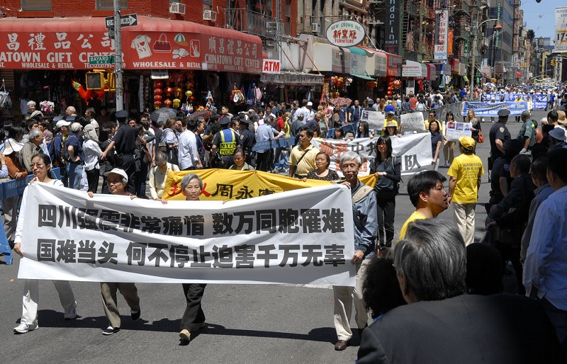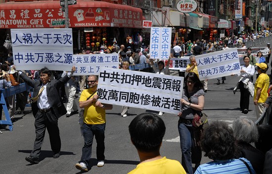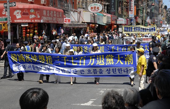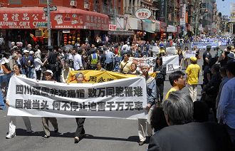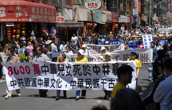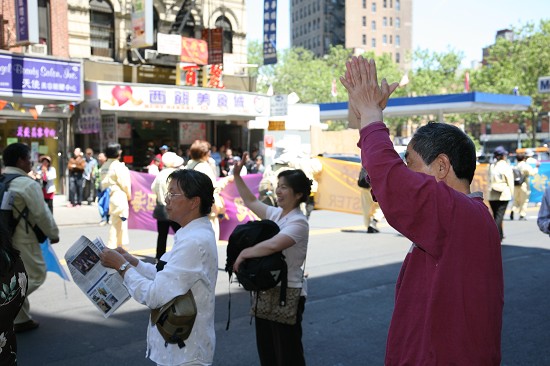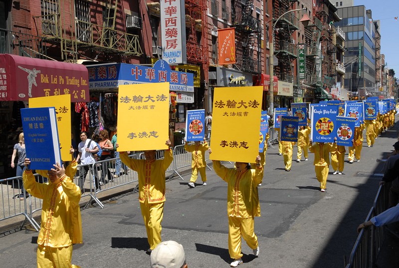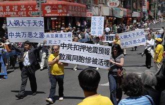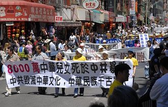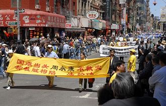 【明慧网二零零八年五月二十六日】(明慧记者周容、沈容纽约采访报导)二零零八年五月二十四日中午,约二千名来自不同国家地区、不同肤色种族、不同职业阶层的法轮功学员齐聚纽约曼哈顿唐人街,向民众展示法轮大法(又称法轮功)的美好及揭露中共迫害法轮功的种种恶行,并声援三千七百万民众退出中共邪*党-组织,宣告中共即将解体的讯息。 浩浩荡荡的游行队伍行进在曼哈顿唐人街 |