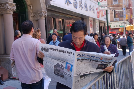 市民认真的在路边阅读《大.纪.元;时报》专刊,其中报导中共一手导演法拉盛事件,围攻并栽赃法轮功学员的退!党!、讲真相活动。 |