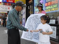 当天,法轮功学员在法拉盛,有的派发法轮功真相资料,展开“法轮大法好”等横幅,及展示中共酷刑迫害法轮功的真相图片。 “这九年来,中共在中国大陆都没有把法轮功镇压下去,不要说海外,这里是民主、法制的国家,中共欲把法轮功学员打垮,更是不可能的事。”易蓉表示,警察已经拘捕了十几个攻击法轮功学员的暴徒,“我们都会将他们绳之以法。” 易蓉表示,今天会有法轮功学员在街头发法轮功的真相资料、讲真相,勇气长城;此外,在傍晚时,法轮功学员还会在中共驻纽约领馆前有烛光夜悼,呼吁停止对法轮功学员的迫害。 唤醒民众了解真相 纽约法轮功学员牟琪琪表示,历史是会重演的。过去耶稣为救世人,被钉在十字架上,可是后来这些迫害正信的人都受到了天谴。现在法轮功学员在蒙难中,仍然坚持不懈向民众讲真相,就是不想让世人重蹈覆辙,将来随着恶党一起受到历史的审判。 中国移民:佩服法轮功学员面对暴力仍坚韧不屈的精神 法拉盛居民胡平从中国上海移民来美四年。在中国大陆时,他从事外贸业务。他说,在中国时就听说中共使用残忍手段迫害法轮功。那时就相信这是真的,自从五月十七日,亲眼看到中共在法拉盛煽动海外华人,使用文革式的手段围攻、谩骂、殴打法轮功学员,就更清楚迫害是真的。“在这自由的土地上,中共都能这样,那么可以想象,在中国的迫害就更厉害。” 他说,与此同时,也看到了法轮功学员在暴力面前“打不还手,骂不还口”的大善大忍精神。“我非常佩服他们的坚韧精神。” 他说,“我是一个基督徒,在中国基督徒也受到了迫害,但是却没有象法轮功一样。我佩服他们的精神,他们是在中国唯一一个面对中共迫害,一直坚韧不屈、不屈不挠反抗中共的团体。没有一个团体象法轮功一样,越被打压,越强大。” 他最后重复了两遍说,“法轮功是中国的希望。”