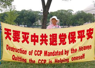 每天从中午一点以后,他们先竖起印有“天灭中共 退党保平安”、“法轮大法好”、“真善忍”的横幅,然后为一车车来自大陆的观光客递上《九评共产党》,《大纪元时报》以及有关法轮功的真相材料,如今已经成了这里一道独特的风景线。 二零零八年七月十三日下午,一位在美国长大的来自加州的越南裔高中生Vic Tran特地走到赵女士的横幅前拍照留念。他表示很高兴在华盛顿看到这一景。因为他的父母都是从越南共产统治下逃出来的,他从小就听说很多有关共产专制统治的残暴,希望更多的人都能了解共产暴政的本质,尽早清除它。 赵女士放弃每月收入上千元的打工机会,而选择在华盛顿DC退党服务中心当义工,人们不禁要问个究竟。原来来自山东的赵女士,因为背部脊椎摔伤,一九九五年被医生宣判为即将瘫痪。就在这时,经人介绍接触到法轮功,她一天读完《转法轮》,从此走上修炼道路,不仅身体完全痊愈,精力充沛,思想上也飞速升华。 身心受益的赵女士,在中共开始迫害法轮功后有幸来到美国。她不愿只从法轮大法中获益而不站出来声援在中国大陆遭受迫害的同修们、揭露中共的本质、让受中共谎言宣传毒害很深的大陆民众了解真相。赵女士和其他义工,从二零零二年起就在华盛顿DC的航天博物馆前草地上,摆放反迫害和展示法轮大法好的图片,同时发放各种相关材料,无论刮风下雨、严寒酷暑,长期坚持不懈。 自从二零零四年十一月《九评共产党》发表以后,二零零五年华盛顿DC退党服务中心成立了,赵女士说,她更感觉到让海内外广大华人同胞退党、退团、退队,让每个人都能脱离中共而得救的紧迫感。有时她在华盛顿DC的航天博物馆前呆很久,直到博物馆闭馆。每当有中国人主动要《九评共产党》或要求退党、退团、退队时,她都倍感欣慰。赵女士说:“我不想错过一个有缘人。” 赵女士说,身体上的劳累之苦,她并不在意。但有时碰到受中共洗脑宣传毒害的学生和成人,她为这些人感到很痛心。在七月十三日下午五时左右,她象往常一样在华盛顿DC的航天博物馆前发放《九评共产党》,大纪元时报及有关法轮功的真相材料,一群随旅游车来参观华盛顿DC航天博物馆的大陆高中学生看到草地上竖着印有“天灭中共、退党保平安”、“法轮大法好”、“真善忍”的横幅,认为这是反对中国,就跑来拔掉横幅。 赵女士回忆说,她想挡在横幅前不让他们拔掉,但因为学生人数多没能阻止。可是在周围买冰淇淋民众、观光客和美国民众看不惯这样违反言论自由的行为,都前来支援赵女士。他们帮忙打电话叫来了四位警察。警察截获了那些见势不好准备逃跑的学生,因这些学生并没有伤及赵女士,警察教育了学生后,释放了他们。警察们表示将保护美国国土上的合法言论自由。 发生这样的事,赵女士并不生气,反而是为那些学生没能了解中共本质,还在受毒害感到可惜。赵女士表示,要继续下去,不舍不弃,不信良知唤不回 。