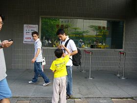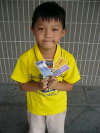 现在快满六岁的陈鼎为,得法已经四年多了。鼎为虽然年纪小,但整本《转法轮》都能读,《洪吟》也会背。鼎为说:「书里面教我做好人,我现在身体有变健康,不容易感冒。」 鼎为最喜欢将法轮大法的书签送给许多叔叔阿姨,他说:「我知道那边有许多小朋友因为爸爸妈妈炼功被抓去关,我觉得他们很可怜,我想把真相告诉他们。我也会跟我朋友说,你要记住法轮大法好。」  将书签递给往来的行人 |