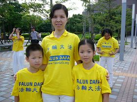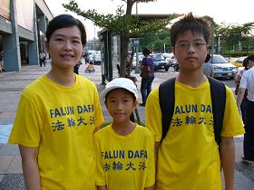 今年十岁的廖映筑和十二岁的哥哥廖冠勋在看到妈妈的改变后,也一起走入修炼的行列。映筑和冠勋的妈妈是国中老师,以前身体很不好,一年的健保卡一年都要看到K,整个身心觉得绝望又空虚,试了很多气功中医都没有用,后来学生的家长介绍法轮功给她,妈妈想那就姑且试试看吧!结果这一试,不但身心转变极大,也让外公、外婆、舅舅与两个孩子一起得法。 映筑说:「师父教我们要真善忍,所以跟别人吵架我会克制自己,学会忍。以前小时候因为肺炎住院过,现在学了之后身体比较好,不会不舒服,感冒也比较少,我想对大陆的小朋友说,希望你们可以坚定,我们会为你们加油。」 哥哥冠勋则表示:「很多小朋友都会玩电动玩具,但我知道那是不好的,我会尽量不去玩。之前我有皮肤病,很痒就一直抓,学了两个月就完全改善了。法轮功很好,我会跟同学说这是一套非常好的功法,可以来试试看。我知道大陆那边有很多小朋友流离失所,我会去征签,我想替他们加油。」[none1]  妈妈和映筑、冠勋 |