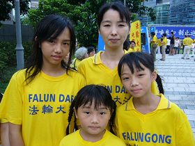 13岁的曾映筑与妹妹曾怡宁、曾钰婷跟着妈妈一起学炼。妈妈表示以前他们很会感冒,现在炼功之后身体变得很健康,感冒次数也减少很多。妹妹怡宁表示:「我们都会去故宫、淡水发资料,我会给同学看法轮功的资料,跟同学吵架的时候,我会先跟同学道歉。我知道大陆的小朋友没有办法像我们一样自由地学炼,我会为他们加油,帮助他们。」  映筑、怡宁(右)、钰婷和妈妈 |