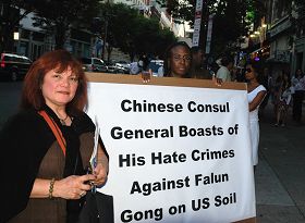 库边女士(左)被牌子上写的中共纽约总领事对法轮功的迫害惊呆了 |