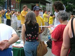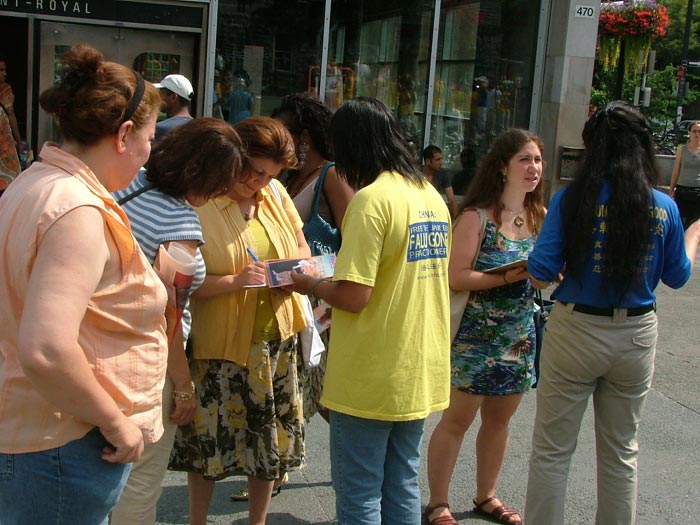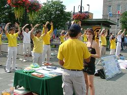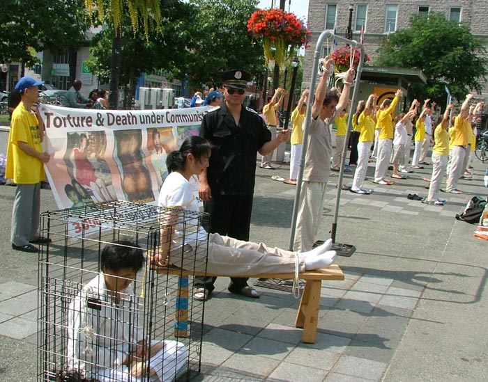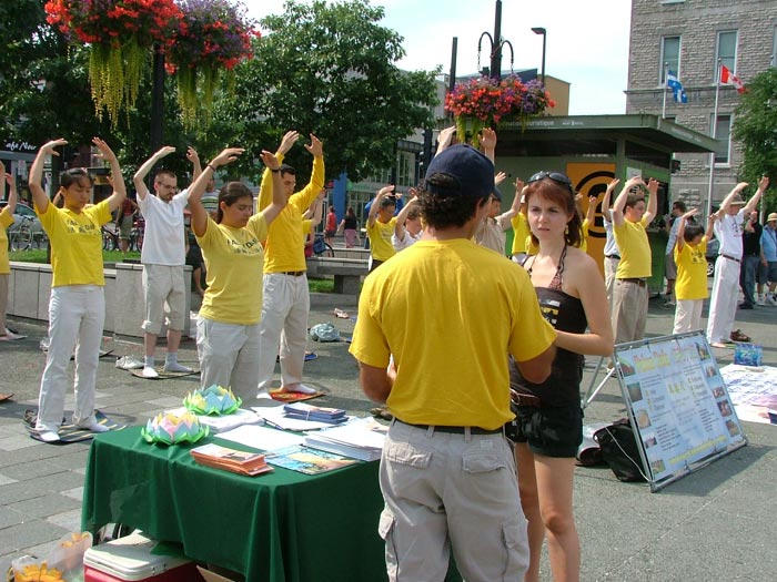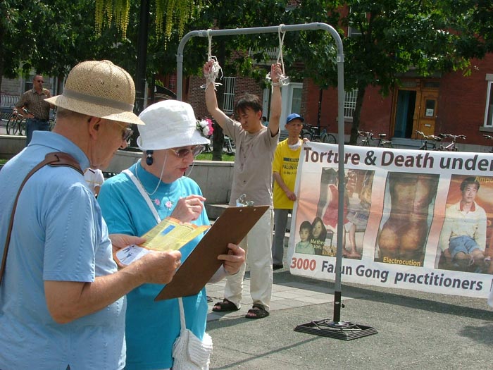 【明慧网二零零八年八月二十五日】(明慧记者肖妍蒙特利尔报导)二零零八年八月二十三日,在蒙特利尔繁华地带Mont-Royal地铁站门前宽阔的广场上,呈现在人们眼前的一组是法轮功学员炼功的场面,另一组是中共迫害法轮功的酷刑展示。川流不息的人群被这两个对比鲜明的场面震惊,停下脚步听法轮功学员讲解,索取资料、签名支持反迫害。  蒙特利尔学员宁静祥和炼功展示大法的美好;反迫害酷刑演示揭露中共邪恶