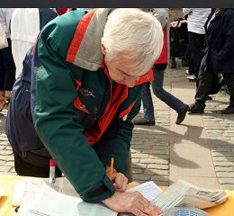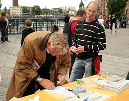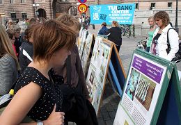 法轮功学员大李一看她还不太清楚退党大潮的事情,于是就耐心从《九评共产党》引发的退党大潮到目前为止全球退党大潮的进展状况给她详细的作了介绍,又从“天安门自焚”讲到中共迫害法轮功、活体摘取法轮功学员器官的暴行,帮助她认清“中共不等于中国”,揭露中共它用来欺骗百姓的一个个谎言,并给她推荐《九评共产党》和各类法轮功的真相资料。她一边听着一边提出各种问题来,当都得到了解答之后,她不住的点着头表示认同。 最后大李笑着说:“您想想,这么大的一件事情到现在您还不知道哪,如果没有今天这个活动,我们怎么能在这里见面?因为我们在海外,信息都是畅通的。中共它在极力封锁消息不让大陆的百姓知道真相。你们能听到的也只能是为中共涂脂抹粉的那一套。现在我们自己家里的亲人和朋友(能打电话联系上的),我们都及时的把退党信息告诉了他们,经过他们的同意该退的全都退出了曾经入过的中共党、团、队邪恶组织。但是还有很多象您这样的什么都不知道的中国同胞哪,甚至还有一些现在还在被中共的谎言所欺骗着的,而且中共它不但欺骗中国人还欺骗了很多的外国人,我们在这里搞这个活动就是要揭露中共迫害法轮功以及活摘法轮功学员器官的暴行,让世界上所有的人都能认清它邪恶的本质。特别是中国大陆的同胞:不但要认清它、还要早日退出它、远离这个邪教组织,只有这样才能为自己选择一个美好的未来!我们都有各自的工作和学校。只是利用自己的业余时间来这里,目地就是为来自大陆的中国同胞退出中共相关组织和西方人了解中共邪恶的本质提供方便。其实我们就是为你而来!” 这位女士也笑了,她说:“可也是啊,我就在瑞典停留两天,明天我就要离开这里了。你说的这些现在我全明白了,法轮功的真相我在国内就听说了,那个‘天安门自焚’的光盘我也看了,知道了中共是在造假。其实现在老百姓对这个党早就失去信心了,很多人都不买它(中共)的帐了。我还以为我早就超龄了、不交团费了就算是退了,跟它(中共)再没什么关系了哪。听你这么一说我也愿意声明退出来。我可不可以拍一些照片带回去把国外的这些事情讲给家里的人听。” 于是她将所有活动的横幅、真相展板一个不落的都照了下来,然后走到桌子旁当场起了笔名声明退出曾经入过的团、队组织。 一位叫Buowslav Klicard的瑞典男士他在真相展板前看仔细的看了很久,最后他走到签名的桌子前,在制止中共迫害法轮功的签名簿上签下了自己的名字,同时他还对学员说:“我一直就关注中国的人权状况,现在中国的人权真是越来越糟糕了。”他要了一份瑞典文的《九评共产党》要带回去认真的读一读。 还有一位住在Stockholm的叫Gaspar Tamas的瑞典人,他正在准备建一个网站,他很想把中共对无辜善良人所犯下的罪行都放到他的网站上去,目的是让更多的人都来关注在中国发生的事情。为早日能改善中国的人权状况,他想尽自己的一点微薄之力。他也在签名簿上签了名,表达自己支持法轮功,同时谴责中共的暴行,最后他和学员聊了很久并记下了联系电话。 活动当天有不少的中国游客都接了报纸和大法真相资料,还有的看到《九评共产党》如获至宝,马上放进自己的背包里,表示回到车上会去看的。看到又有这么多的中西方人士了解了法轮功真相,认清了中共邪党的本质,法轮功学员感到由衷的欣慰。他们表示会继续向更多的人去讲清真相,揭露中共对法轮功长达九年多的残酷迫害,迫害一天不停止,讲真相就永远不会停。