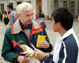 法轮功学员向瑞典人Gaspar Tamas讲真相 |