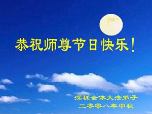 在2008年中秋佳节来临之际,深圳全体大法弟子恭祝慈悲伟大的师父中秋节快乐! 深圳大法弟子 2008年9月7日 哈尔滨大法弟子恭贺慈悲的师尊中秋佳节快乐!