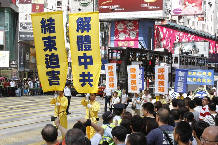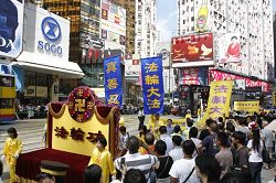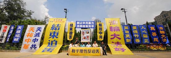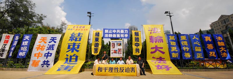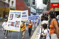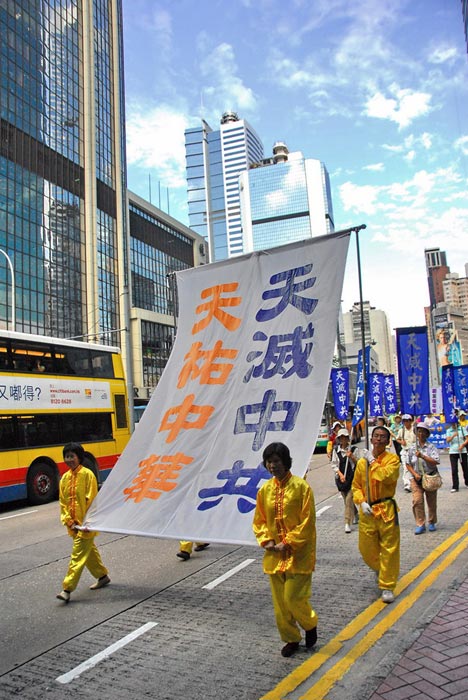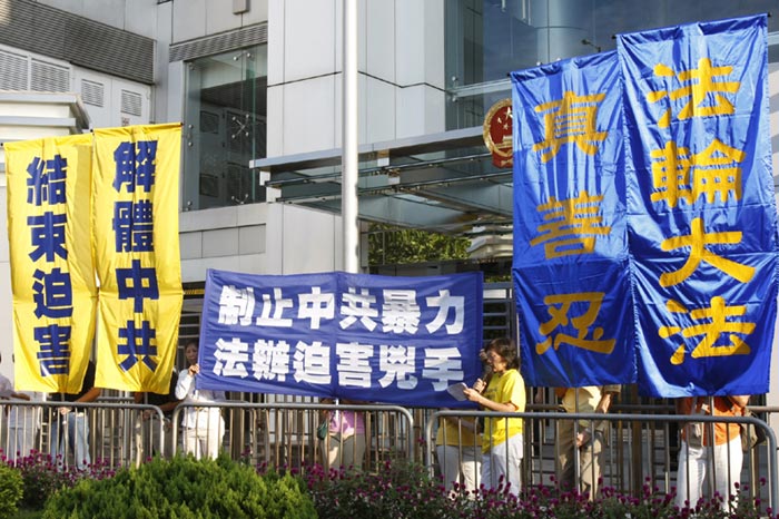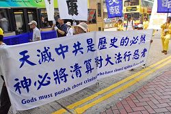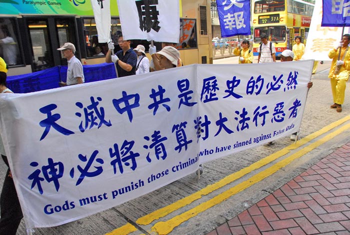以下是香港法轮功学员在中联办宣读的声明: 制止中共暴力 法办迫害凶手自一九九九年七月中共江泽民集团发动对法轮功的非法镇压以来,中共当局不但在中国大陆穷凶极恶,更将迫害的黑手延伸到海外。在香港,自镇压开始以来,中共当局一直胁迫港府诬蔑、压制法轮功,诬告和平抗议的法轮功学员,妄图订立针对法轮功的恶法,以至实行入境“黑名单”,一再强制遣返外地合法来港的法轮功学员。 而在中国国土以外,中共同样肆意行凶,在多国发动流氓特务对法轮功进行恐怖袭击。特别是今年五月十二日四川大地震以来,在国难当头之时,中共当局无法推卸其造成惨重伤亡的罪责,在天怒民愤下面对深重危机,濒临解体,为了转移视线,特务头子周永康一伙在纽约法拉盛华人社区发动特务、帮凶诬蔑法轮功阻挠赈灾,煽动仇恨,进而纠集不明真相的民众,对当地退出中共服务点发动围攻与暴力袭击。 临近奥运期间,中共当局也施压港府,强迫一些部门采取压制行动,以至在中联办外,接连发生食环署与警方强抢法轮功学员用于和平抗议的横幅的恶性事件。 在北京奥运期间,中共当局更变本加厉,除了继续在中国大陆大肆抓捕法轮功学员外,还在香港制造暴力攻击事件。八月十一日,法轮功学员如常在中联办前门外和平抗议时,女学员刘惠卿尝试用相机拍照,突然被一名女保安员用雨伞袭击,打伤手部,事后对方不但不愿道歉和解,反而诬告被打。 八月二十一日,数名法轮功学员在和平抗议时被中联办员工喷水溅湿,其中一名学员邝森洽要拍照取证时,又被该员工出手打伤,相机损坏。据学员指出,自今年五月底以来,在中联办门外的和平抗议活动经常受到有关人员的骚扰与攻击,显然是由中联办当局唆使的有计划行动。然而,港府执法人员不但没有充份保障和平请愿者的表达权利,将凶徒绳之以法,反而配合中联办诬告学员,这种包庇邪恶打压善良的做法,显然与执法人员维护社会公义的原则背道而驰。 在九年多的严酷迫害中,中国大陆数以千万计修炼“真、善、忍”的法轮功学员承受着巨大的苦难,经历这个星球上从未有过的邪恶。据不完全统计,至少已有三千一百九十二名确认身份的大陆学员被中共迫害致死,数十万名学员被非法关押、劳教、进洗脑班,超过五百人被非法判处十八年以上徒刑。残酷的迫害手段包括谋杀、上百种酷刑、强奸、精神迫害和隔离、强迫注射损害神经的药物等。尤有甚者,数以千计不知名的法轮功学员被毫无人性的中共屠夫活摘器官来贩卖营利。 中共对法轮功的迫害已经构成全球最大的人权灾难。而更为广泛的迫害发生在中共恶党推行国家恐怖主义的过程中,众多法轮功学员妻离子散、居无定所、流离失所,千万法轮功学员的家属、亲朋好友和同事受到不同程度的株连与洗脑,全国十四亿人民当中,不少在中共的欺世谎言洗脑下被蒙蔽良知、煽动仇恨,不同程度的参与了对法轮功的迫害。在中共加剧打压善良、深化贪污腐败、唯私唯我的氛围下,中国的社会道德急速下滑,整个国家民族被推到非常危险的境地。 九年多以来,举世的法轮功学员坚持不懈的和平理性讲真相,呼吁停止迫害,为的就是唤醒世人的良知,特别是对于中国大陆深受中共谎言毒害的广大民众,他们更为迫切的需要了解这场迫害的真相。由于中共屡劝而不改,其罪魁祸首与无良帮凶执意延续迫害,我们认识到只有和平解体中共恶党,才能结束各界各族民众的苦难,才能解救整个国家民族的深重危机,才能复兴灿烂辉煌的中华神传文化,才能使中国人民走向光明的未来,当中包括那些被中共邪灵恶党捆绑而良知尚存的众多党徒。法轮功学员在2004年底发表《九评共产党》揭示中共的邪恶本质,继而推动退出中共运动(三退,即退党、退团、退队),其根本原因就在于此。这是一场波澜壮阔的全民良知觉醒、脱离邪恶、绝地自救的伟大运动,至今已有超过4300万人公开宣布退党、退团、退队(三退)。中共不等于中国,也不是它所附体与劫持的中国政府。只有解体中共,才能彻底结束中共对中华民族的迫害,我们的国家民族才有美好的未来。 明乎此,也就明白法轮功学员在各地和平理性讲真相、传九评、促三退的目的所在,我们不是为了自己。九年多来,面对中共恶党策动、香港特区政府协同而一再横加于我们的诬陷、打压与不公,香港的法轮功修炼者始终如一的向特区政府各级官员劝善,希望他们能明辨是非,分清善恶,抑恶扬善,为自己、为港人铺垫美好的未来。当前之事,如果任令中联办与中共势力在香港行凶做恶而不制止而不法办,任令他们无法无天欺压善良、诬告无辜;如果任令中共强加的黑名单继续肆虐,各地善良民众继续被拒绝入境;如果任令一些部门继续在中共压力下助纣为虐,这就不单只是压制人权法治,不单只是破坏所谓的“一国两制”,不单只是香港的声誉受损,更根本更严重的问题是任令邪恶嚣张、正气受压,整个社会的正义良知被颠覆。自古以来,人类都相信善恶有报,多行不义必自毙,一个良知泯灭的社会将给自己带来多么严重的后果,历史上早有先例。我们绝不希望由于港府当局的过失而给香港及港人带来不可弥补的损害。我们恳切呼吁港府当局择善而行,切勿沦为中共的帮凶。 法轮大法学会在2005年10月9日发表的公告中早已指出:天灭中共是历史的必然,神必将清算对
