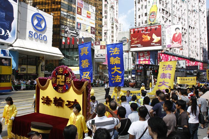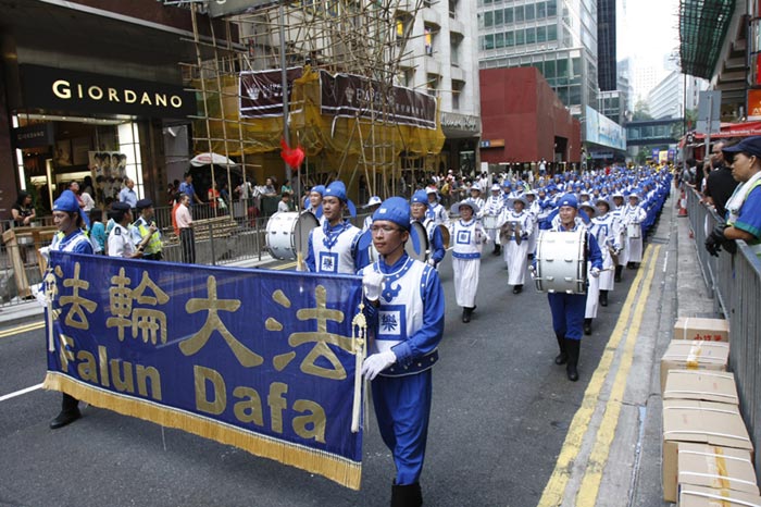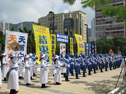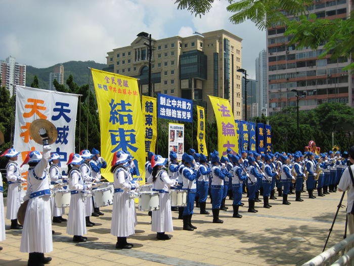 | 【明慧网二零零八年九月二十二日】在北京奥运期间及前后,香港接连发生法轮功学员在中联办和平抗议时遭到骚扰与攻击的事件,两名法轮功学员先后被中联办人员打伤,其中一人反遭中联办诬告。在同一段时间,并有许多名法轮功学员被港府无理拒绝入境。 针对中共当局蓄意制造攻击及诬陷事件,以及港府屈从中共加剧打压法轮功的情况,二零零八年九月二十日,香港法轮功学员举行“制止中共暴力,法办迫害凶手”集会大游行,抗议中共当局在香港炮制针对法轮功的暴力袭击与诬蔑构陷,并呼吁社会各界伸张正义良知,制止中共当局对法轮功的迫害,将迫害元凶及幕后操纵者绳之于法。  旗鼓队雷鼓声动,为“制止中共暴力,法办迫害凶手”集会及大游行揭开序幕。 |