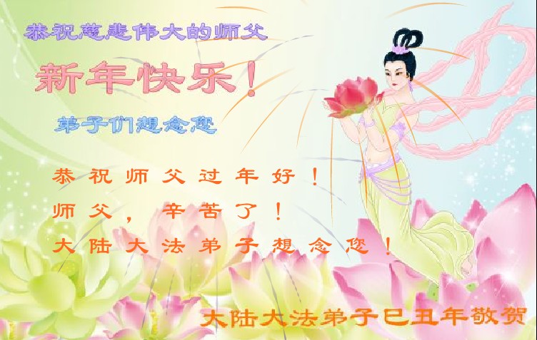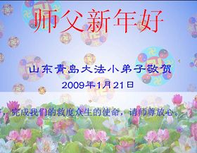 | 【明慧网二零零九年一月二十五日】 中国朝鲜族大法弟子向师父拜年 成都大法弟子恭祝师尊过年好! 河南商丘全体大法弟子向师父拜年 湖南新晃全体大法弟子向师父拜年 石家庄大法弟子恭祝师父过年好! 青岛大法小弟子给师父拜年,祝师父新年快乐! 闪画:河北邯郸大法弟子恭贺伟大的师尊新年好! 全世界大法弟子恭祝师尊新年好! 中国朝鲜族大法弟子向师父拜年