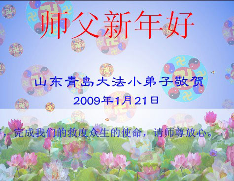 恭祝师父过年好!师父,辛苦了!大陆大法弟子想念您! 正法修炼路 全凭师呵护 师恩无言表 唯愿师尊笑 在新的一年里,我们一定更加精進,救度更多的众生。请师尊放心! 石家庄大法弟子敬上 二零零九年一月十九日 观看闪画(2.6MB) 青岛大法小弟子给师父拜年,祝师父新年快乐!