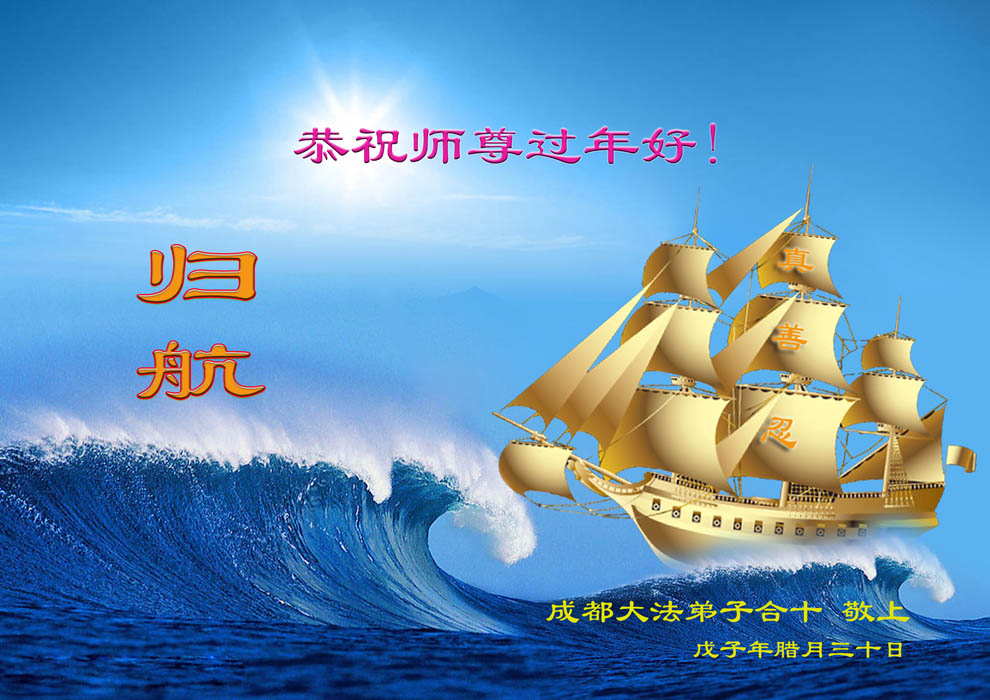 浊浪中一叶叶孤舟,在历史长河中浮沉。何始?何终?何处是归途? 是恩师为众生撑起巨帆,遮风挡雨,驱散迷雾,指明航向! 荣耀啊!我们肩负着历史使命,将随师归航! 归航 孤帆一叶舟 随波逐浊流 迷在情中不知苦 却把他乡当故乡 何处才是归航 法光耀寰宇 归真路上行 辗转漂泊终有望 蒙尘心间现霞光 从此踏上归航 恶浪拍——欲摧 黑云压桅桅欲碎 几多执着如巨缆 红尘恋恋难中徘徊 苦海无岸何时能归 金色巨帆迎风扬 驱散阴霾驳航向 亿舸争流奋摇桨 逆水行舟迎难而上 满载众生随师归航 成都大法弟子合十 敬上 戊子年腊月三十 观看动画(18.3MB) 河南商丘全体大法弟子向师父拜年