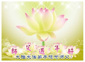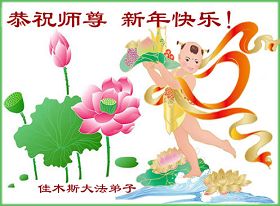 在新年到来之际,我们石家庄全体大法弟子向慈悲伟大的师尊致以最崇高真挚的敬意!请师父放心,我们一定在新的一年里更勇猛精進,放下人心,救度众生,不辱使命,不惧风雨,坚如磐石,一路随师行!拜谢师尊对我们石家庄大法弟子的呵护看管!我们一定把对师父的感恩化作救度众生的动力,讲清真相,清除邪恶,整体升华,让师父少一些操劳,多一份欣慰!给慈悲伟大至尊至敬的师尊拜年!为了表达我们的心声,特献上对联两幅,以谢师恩! 师徒同心 千歌万曲唱不尽师恩浩荡挽穹宇 千魔万鬼撼不动徒心坚定救人急 普天同拜 天上人间同拜师尊过年好 神州万里同颂法光普天照 合十 石家庄大法弟子敬呈 二零零九新年前夕 河北省邢台市大法弟子恭祝慈悲伟大的师尊过年好!