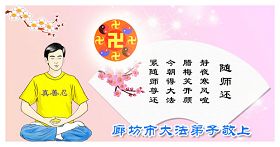 法轮大法光芒照射, 法正乾坤师尊决策。 恭祝师尊新年快乐, 大法弟子表现出色。 急速救人时时刻刻, 宇宙更新邪恶全灭。 佳木斯大法弟子 2009年1月14日 佳木斯三人学法小组恭祝师尊新年快乐!