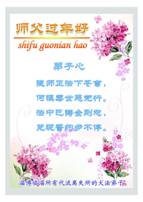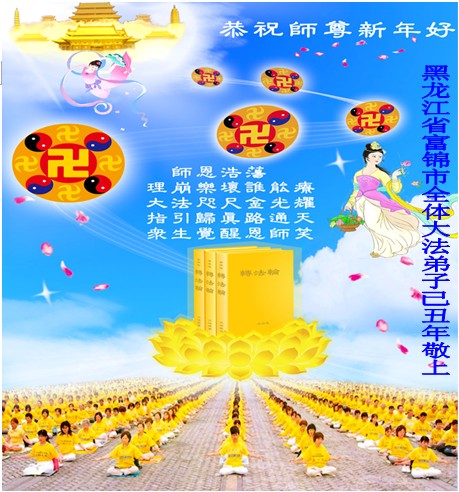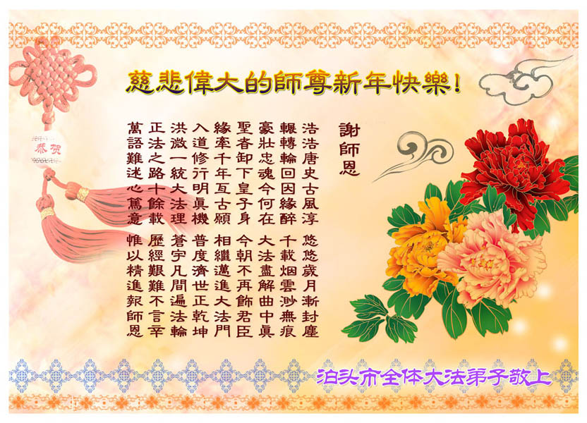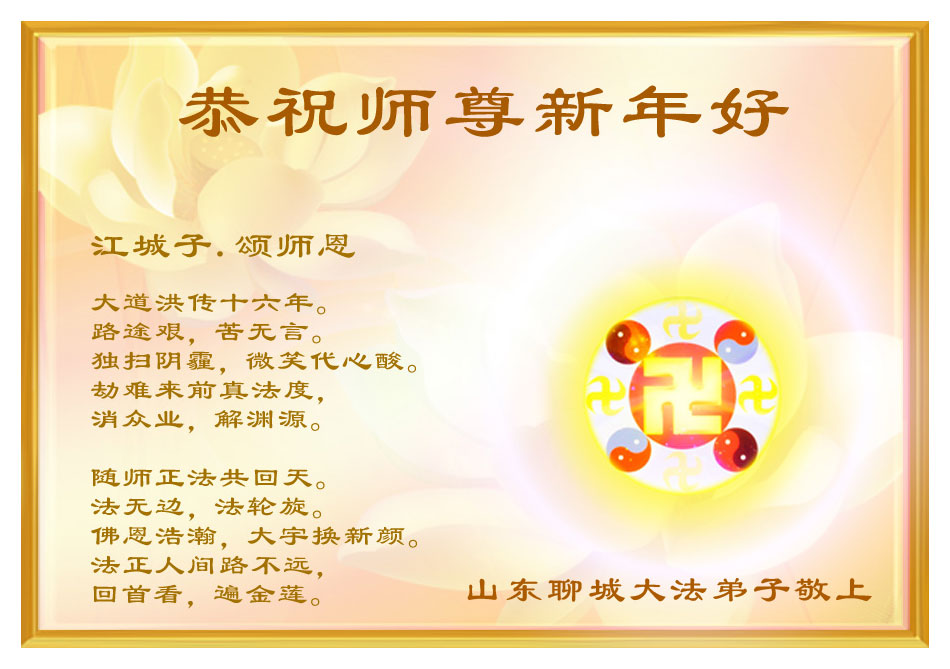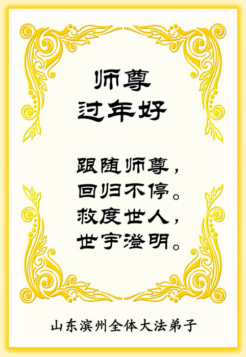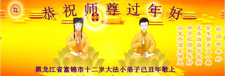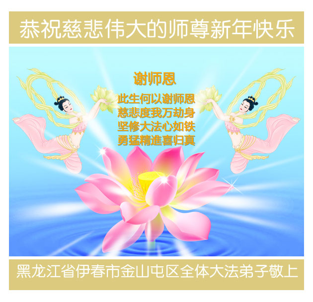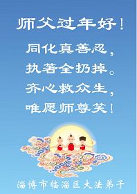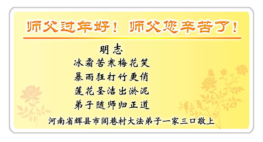 冬寒即逝,隐见阳春。 远隔重洋,遥念师尊。 勇猛精進,跃出凡尘。 救度众生,法正乾坤。 井陉县全体大法弟子敬祝 二零零九年一月十八日 石家庄全体大法弟子恭祝伟大的师尊新年好!山东泰安地区大法弟子恭祝师尊过年好!四川内江市大法弟子祝慈悲伟大的师尊过年好!黑龙江省集贤县大法弟子祝师尊新年好!黑龙江双城市大法弟子祝师尊新年好!山东聊城大法弟子恭祝师尊新年快乐!江城子•颂师恩 大道洪传十六年。 路途艰,苦无言。 独扫阴霾,微笑代心酸。 劫难来前真法度, 消众业,解渊源。 随师正法共回天。 法无边,法轮旋。 佛恩浩瀚,大宇换新颜。 法正人间路不远, 回首看,遍金莲。 山东聊城大法弟子敬上 二零零九年一月十八日 潍坊在大连的大法弟子恭祝师父过年好!泊头市全体大法弟子恭祝慈悲伟大的师尊新年快乐!谢师恩 浩浩唐史古风淳 悠悠岁月封厚尘 辗转轮回业里醉 千载烟云渺无痕 红尘如梦聚又散 国道兴衰荡漾频 且问人生蕴何意 几时能解迷中真 缘牵千年亘古愿 相继迈進大法门 入道修行明真机 普度济世正乾坤 正法之路十余载 历经艰难不言辛 洪微一统大法理 苍宇凡间遍法轮 万语难述心笃意 唯以精進报师恩 泊头市全体大法弟子敬上 河北省张家口桥西大法弟子恭祝师尊新年好!潍坊大法弟子祝师尊新年快乐!尊敬的师父: 我们潍坊大法弟子在零九年来临之际,首先祝师父新年好!在新的一年里,我们要按照师父的教导和要求断续做好三件事,特别是在讲真相和劝三退中,走到哪里就要在哪里开创出一片天来。在最后短暂的时间里,尽快的收救更多的众生,来完成我们的史前大愿,跟师父回家。请师父放心,让师父少一份操劳,多一份欣慰。 潍坊大法弟子敬上 大连大法弟子祝师尊新年好!武汉大法弟子给师父拜年,恭祝师父过年好!黑龙江省伊春市金山屯区全体大法弟子恭祝慈悲伟大的师尊新年快乐!谢师恩 此生何以谢师恩 慈悲度我万劫身 坚修大法心如铁 勇猛精進喜归真 河北省景县全体大法弟子恭祝师尊新年好!河南南召县全体大法弟子问候师尊新年好!前進镇全体大法弟子问候师尊新年好!扶风县全体大法弟子恭祝伟大的师尊新年好!河南方城县全体大法弟子问候师尊新年好!徐州贾汪被非法关押的大法弟子向师尊拜年!师尊新年好!徐州贾汪大法弟子敬上 达州市大法弟子敬祝师父过年好!七台河大法小弟子给师父拜年七台河一家三口学法小组大法弟子向师尊拜年感谢多年来对弟子慈悲呵护,师恩无以为报,唯有精進。 七台河大法弟子敬上 佳木斯母女大法弟子恭祝师尊新年好母女同修炼, 大法天天看。 神念去救人, 助师了洪愿。 佳木斯母女大法弟子 2009、1、19、 佳木斯大法弟子恭祝师尊过年好至高无上转法轮, 字字都是佛道神。 句句体现真善忍, 大法指引我前進。 广大众生快觉醒, 大法温暖人的心。 做到三退能保命, 感谢伟大的师尊。 佳木斯大法弟子 2009、1、19、 佳木斯大法弟子恭祝师尊新年快乐大法弟子幸运无比, 伟大师尊亲自度你。 修成神佛取决自己, 救度众生负责到底。 珍惜机缘别在痴迷, 前途命运自己争取。 佳木斯大法弟子 2009、1、19、 乘凤庄全体大法弟子恭祝慈悲伟大的师尊新年快乐大兴安岭地区、新林区、大乌苏大法弟子祝师尊过年好黑龙江省克山县大法弟子祝师尊过年好龙凤地区大法弟子祝师父新年好大庆油田乘三村全体大法弟子祝师尊过年好大庆卧里屯全体大法弟子祝师尊过年好大庆地区全体大法弟子恭祝慈悲伟大的师尊新年快乐!师尊新年好! 大庆地区全体大法弟子向慈悲、伟大的师尊拜年! 在修炼的路上、在随师正法的过程中,在师尊慈悲的呵护下,我们在逐渐走向成熟、走向未来。现在我们更清醒、理智的认识到了我们身负的责任重大,不辜负师尊的苦度,向内找,修好自己、走正、走好修炼的路是我们必须要做好的。只有修好自己的同时才能做好师尊要求我们的三件事,才能圆容好家庭、社会,才能形成强大的整体力量,才能更好的完成历史赋予我们的使命,我们一定会让师尊满意、让师尊放心。有师在,有法在我们会越做越好,不辜负师尊的苦度,圆满随师回新宇。 合十敬上 大庆地区全体大法弟子 二零零九年新年 河北省衡水市全体大法弟子恭祝师父新年快乐我们一定谨记师尊的教诲,修心归正,做好三件事,慈悲救人,兑现史前洪愿!圆满随师还。 弟子们向师父跪拜合十,叩首拜年。 黑龙江农垦红五月大法弟子祝师父新年好辽宁大法弟子恭祝师尊过年好胜利油田大法弟子祝师尊新年快乐!在新的一年里,胜利油田大法弟子一定不忘师尊教诲,认真做好三件事,勇猛精進! 胜利油田大法弟子 叩拜 桦川县私企大法弟子恭祝师尊新年快乐桦川县全体大法弟子恭祝师尊新年好山东省青州市大法弟子叩拜师尊恭祝师尊新年好,师父您辛苦了!黑龙江省富锦市全体大法弟子恭祝师尊新年好黑龙江省富锦市农村全体大法弟子恭祝师尊过年好黑龙江省富锦市十二岁大法小弟子恭祝师尊过年好黑龙江省富锦市大法弟子及家人恭祝师尊新年好全体大庆市红岗区及采油四厂大法弟子给师父拜年!恭祝师尊过年好!谢谢师尊慈悲救度! 在新的一年里我们要共同精進,圆容形成整体,共同做好“三件事”。 武汉市全体大法弟子恭祝师尊新年好永随师行 辞旧岁清除邪恶讲真相 迎新春救度众生话师恩 武汉市全体大法