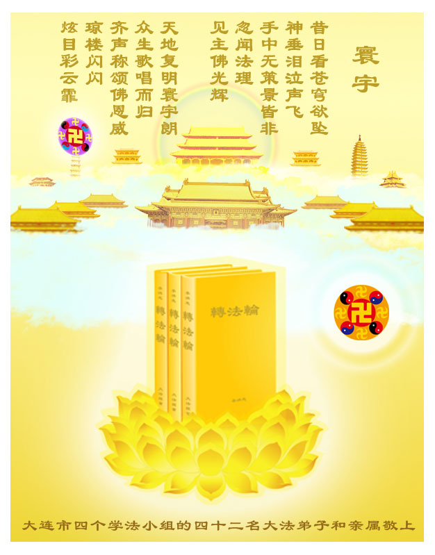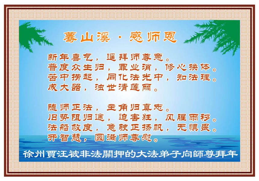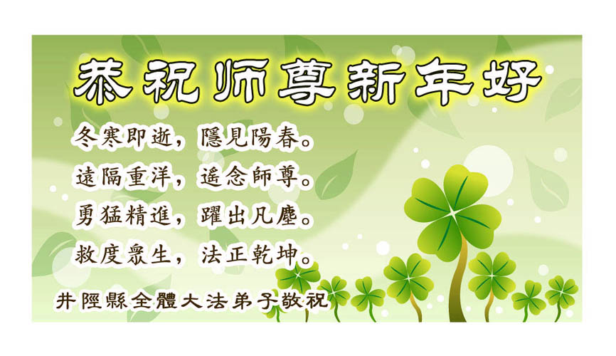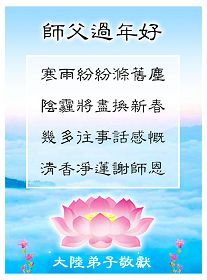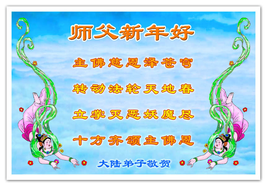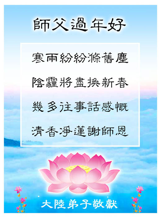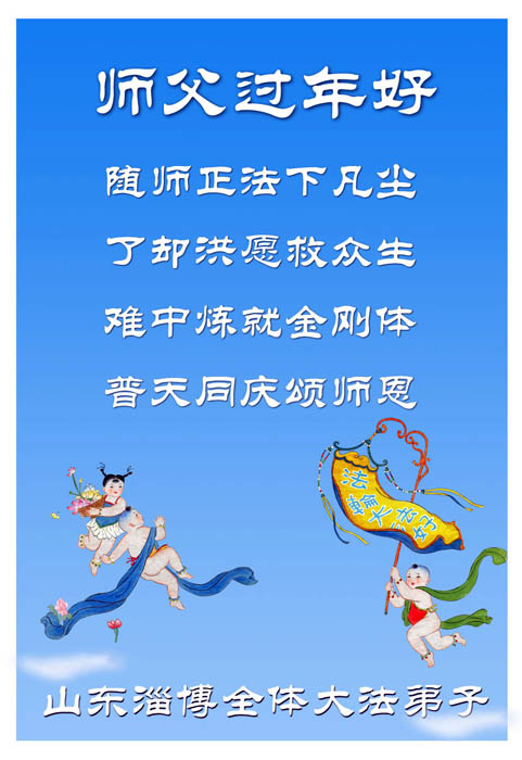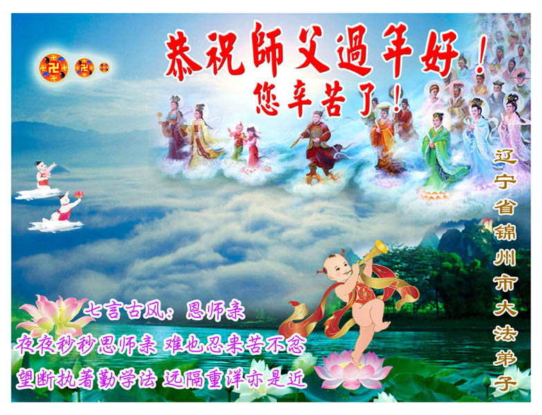 冬寒即逝,隐见阳春。 远隔重洋,遥念师尊。 勇猛精進,跃出凡尘。 救度众生,法正乾坤。 井陉县全体大法弟子敬祝 二零零九年一月十八日 石家庄全体大法弟子恭祝伟大的师尊新年好!山东泰安地区大法弟子恭祝师尊过年好!四川内江市大法弟子祝慈悲伟大的师尊过年好!黑龙江省集贤县大法弟子祝师尊新年好!黑龙江双城市大法弟子祝师尊新年好!山东聊城大法弟子恭祝师尊新年快乐!江城子•颂师恩 大道洪传十六年。 路途艰,苦无言。 独扫阴霾,微笑代心酸。 劫难来前真法度, 消众业,解渊源。 随师正法共回天。 法无边,法轮旋。 佛恩浩瀚,大宇换新颜。 法正人间路不远, 回首看,遍金莲。 山东聊城大法弟子敬上 二零零九年一月十八日 潍坊在大连的大法弟子恭祝师父过年好!泊头市全体大法弟子恭祝慈悲伟大的师尊新年快乐!谢师恩 浩浩唐史古风淳 悠悠岁月封厚尘 辗转轮回业里醉 千载烟云渺无痕 红尘如梦聚又散 国道兴衰荡漾频 且问人生蕴何意 几时能解迷中真 缘牵千年亘古愿 相继迈進大法门 入道修行明真机 普度济世正乾坤 正法之路十余载 历经艰难不言辛 洪微一统大法理 苍宇凡间遍法轮 万语难述心笃意 唯以精進报师恩 泊头市全体大法弟子敬上 河北省张家口桥西大法弟子恭祝师尊新年好!潍坊大法弟子祝师尊新年快乐!尊敬的师父: 我们潍坊大法弟子在零九年来临之际,首先祝师父新年好!在新的一年里,我们要按照师父的教导和要求断续做好三件事,特别是在讲真相和劝三退中,走到哪里就要在哪里开创出一片天来。在最后短暂的时间里,尽快的收救更多的众生,来完成我们的史前大愿,跟师父回家。请师父放心,让师父少一份操劳,多一份欣慰。 潍坊大法弟子敬上 大连大法弟子祝师尊新年好!武汉大法弟子给师父拜年,恭祝师父过年好!黑龙江省伊春市金山屯区全体大法弟子恭祝慈悲伟大的师尊新年快乐!谢师恩 此生何以谢师恩 慈悲度我万劫身 坚修大法心如铁 勇猛精進喜归真 河北省景县全体大法弟子恭祝师尊新年好!河南南召县全体大法弟子问候师尊新年好!前進镇全体大法弟子问候师尊新年好!扶风县全体大法弟子恭祝伟大的师尊新年好!河南方城县全体大法弟子问候师尊新年好!徐州贾汪被非法关押的大法弟子向师尊拜年!师尊新年好!徐州贾汪大法弟子敬上 达州市大法弟子敬祝师父过年好!七台河大法小弟子给师父拜年七台河一家三口学法小组大法弟子向师尊拜年感谢多年来对弟子慈悲呵护,师恩无以为报,唯有精進。 七台河大法弟子敬上 佳木斯母女大法弟子恭祝师尊新年好母女同修炼, 大法天天看。 神念去救人, 助师了洪愿。 佳木斯母女大法弟子 2009、1、19、 佳木斯大法弟子恭祝师尊过年好至高无上转法轮, 字字都是佛道神。 句句体现真善忍, 大法指引我前進。 广大众生快觉醒, 大法温暖人的心。 做到三退能保命, 感谢伟大的师尊。 佳木斯大法弟子 2009、1、19、 佳木斯大法弟子恭祝师尊新年快乐大法弟子幸运无比, 伟大师尊亲自度你。 修成神佛取决自己, 救度众生负责到底。 珍惜机缘别在痴迷, 前途命运自己争取。 佳木斯大法弟子 2009、1、19、 乘凤庄全体大法弟子恭祝慈悲伟大的师尊新年快乐大兴安岭地区、新林区、大乌苏大法弟子祝师尊过年好黑龙江省克山县大法弟子祝师尊过年好龙凤地区大法弟子祝师父新年好大庆油田乘三村全体大法弟子祝师尊过年好大庆卧里屯全体大法弟子祝师尊过年好大庆地区全体大法弟子恭祝慈悲伟大的师尊新年快乐!师尊新年好! 大庆地区全体大法弟子向慈悲、伟大的师尊拜年! 在修炼的路上、在随师正法的过程中,在师尊慈悲的呵护下,我们在逐渐走向成熟、走向未来。现在我们更清醒、理智的认识到了我们身负的责任重大,不辜负师尊的苦度,向内找,修好自己、走正、走好修炼的路是我们必须要做好的。只有修好自己的同时才能做好师尊要求我们的三件事,才能圆容好家庭、社会,才能形成强大的整体力量,才能更好的完成历史赋予我们的使命,我们一定会让师尊满意、让师尊放心。有师在,有法在我们会越做越好,不辜负师尊的苦度,圆满随师回新宇。 合十敬上 大庆地区全体大法弟子 二零零九年新年 河北省衡水市全体大法弟子恭祝师父新年快乐我们一定谨记师尊的教诲,修心归正,做好三件事,慈悲救人,兑现史前洪愿!圆满随师还。 弟子们向师父跪拜合十,叩首拜年。 黑龙江农垦红五月大法弟子祝师父新年好辽宁大法弟子恭祝师尊过年好胜利油田大法弟子祝师尊新年快乐!在新的一年里,胜利油田大法弟子一定不忘师尊教诲,认真做好三件事,勇猛精進! 胜利油田大法弟子 叩拜 桦川县私企大法弟子恭祝师尊新年快乐桦川县全体大法弟子恭祝师尊新年好山东省青州市大法弟子叩拜师尊恭祝师尊新年好,师父您辛苦了!黑龙江省富锦市全体大法弟子恭祝师尊新年好黑龙江省富锦市农村全体大法弟子恭祝师尊过年好黑龙江省富锦市十二岁大法小弟子恭祝师尊过年好黑龙江省富锦市大法弟子及家人恭祝师尊新年好全体大庆市红岗区及采油四厂大法弟子给师父拜年!恭祝师尊过年好!谢谢师尊慈悲救度! 在新的一年里我们要共同精進,圆容形成整体,共同做好“三件事”。 武汉市全体大法弟子恭祝师尊新年好永随师行 辞旧岁清除邪恶讲真相 迎新春救度众生话师恩 武汉市全体大法