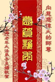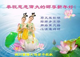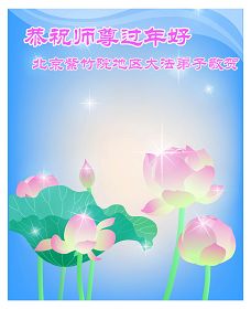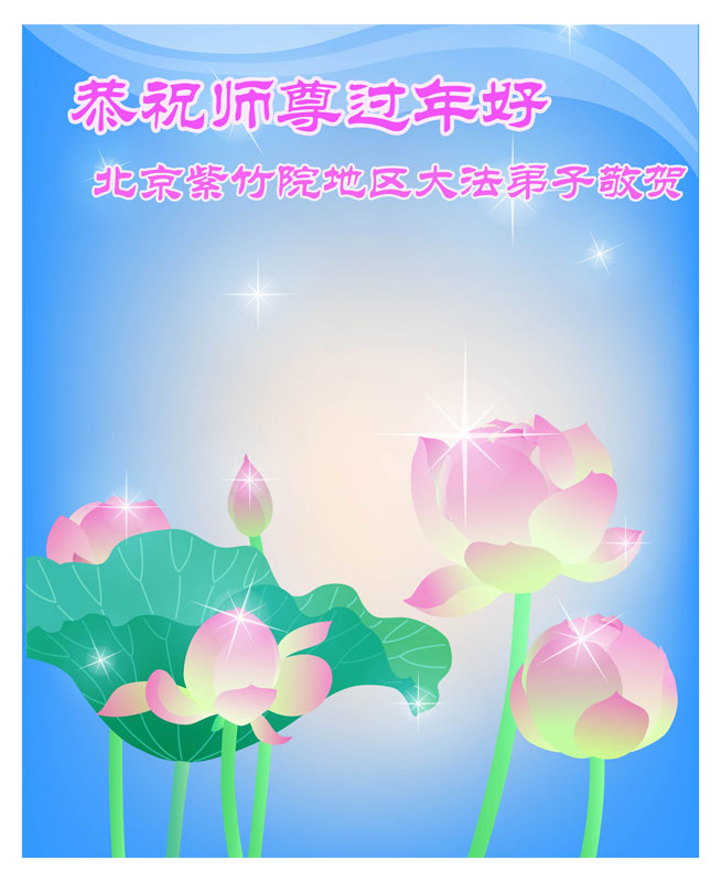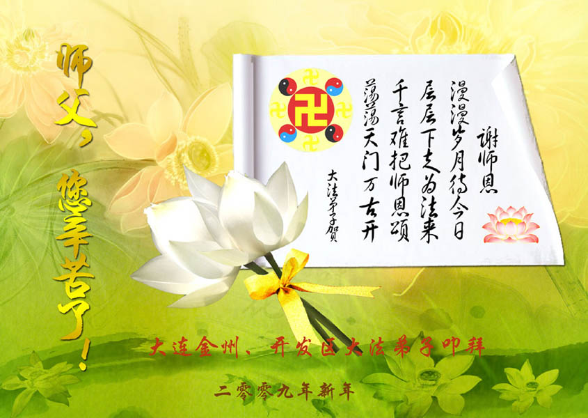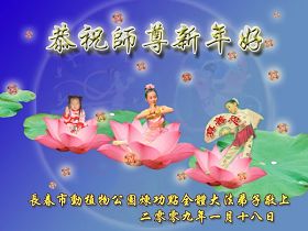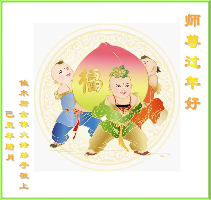 【明慧网二零零九年一月二十五日】上海老年大法弟子夫妇恭贺慈悲伟大的师尊新年好!大连个体经商户大法弟子恭贺师父新年好!北京紫竹院地区大法弟子恭祝师尊过年好!佳木斯全体大法弟子恭祝师尊新年好!四川资阳大法弟子恭祝师尊新年快乐!大连及金州大法弟子恭祝师尊新年好!弟子想念您!成都大法弟子恭祝师尊新年好!黑龙江大庆大同区全体大法弟子恭祝师父新年快乐!请师父放心,我们将做好“三件事”,完成大法弟子的使命。 大庆大同区全体大法弟子、第八采油厂全体大法弟子叩拜 大连金州、开发区大法弟子恭祝师尊新年快乐!长春市动植物公园全体大法弟子恭祝慈悲伟大的师尊新年好!修炼中,弟子们无不感到师尊的慈悲呵护;每一步提高,不知里面溶進师尊多少心血和巨大承受。我们作为正法时期的大法弟子,今后一定做好三件事,精進实修,广传真相,救度更多众生,完成史前大愿,满载众生随师还。 长春市动植物公园全体大法弟子 二零零九年一月十八日