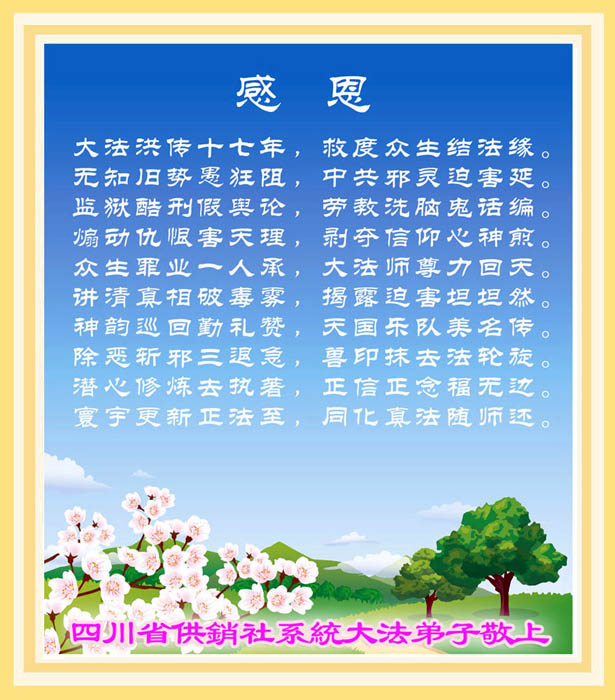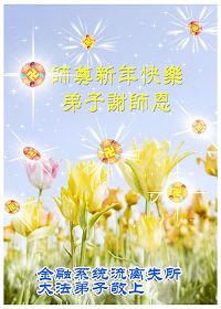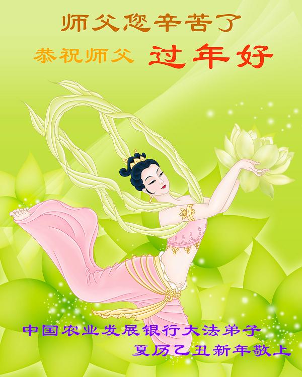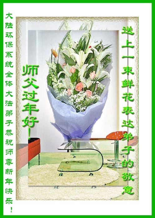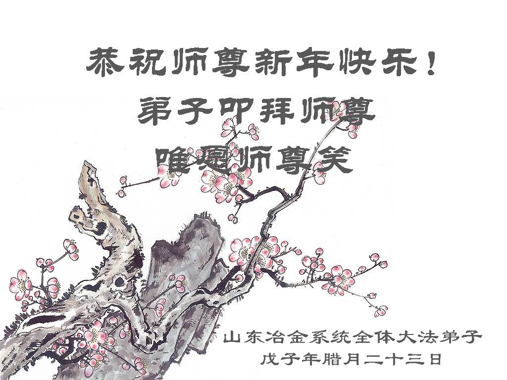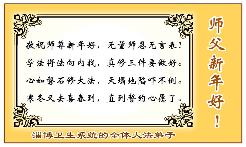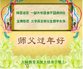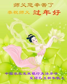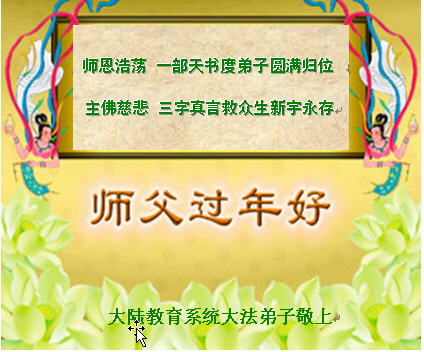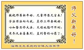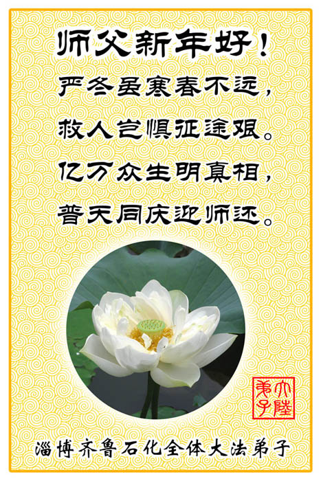 【明慧网二零零九年一月二十五日】全国化工系统的大法弟子给师父拜年!恭祝师尊新年快乐!在新年来临之时,全国化工系统大法弟子给师父拜年!恭祝师尊新年快乐!师父辛苦了! 全国化工系统大法弟子敬上 大陆物业行业大法弟子祝师父过年好!师父好: 我在物业工作已有十一个年头,迫害期间,我在单位遇到很大压力,但不管怎样,环境是越来越好。我会以法为师,做好大法弟子该做的一切。祝师父新年快乐,万事如意! 大陆物业行业一大法弟子 二零零九年正月初一 大陆金融系统所有流离失所的大法弟子恭祝师尊新年快乐!弟子谢师恩!大连所有医疗界大法弟子恭贺师父过年好!方正林业局流离在外的大法弟子恭祝师尊新年好!吉林大学全体大法弟子恭祝师父新年好!吉林农业大学全体大法弟子恭祝师父新年好!山东淄博五区三县教育系统的大法弟子恭祝慈悲伟大的师尊新年快乐!山东省东营市、胜利油田教育界大法弟子恭祝师父过年好!大陆医学界大法弟子祝师父新年快乐!大陆煤炭行业的全体大法弟子叩拜伟大慈悲的师尊新年好!在新年到来之际,煤炭行业的全体大法弟子祝师尊新春快乐!新年好! 我们一定兑现自己的史前誓愿,请师尊放心。请师尊笑看众弟子! 国家电网公司全体大法弟子祝慈悲伟大的师父己丑年新年快乐!己丑新年天放光, 神人共愤灭邪党。 铲除马列复中华, 退出中共命无伤。 华夏儿女齐奋起, 不做犬儒当自强。 电网公司大法弟子 2009年1月16日 山东莱钢大法弟子恭祝师尊新年快乐!大连全体服务行业大法弟子恭贺师父新年好!山东冶金系统全体大法弟子恭祝师尊新年快乐!兰州教育系统大法弟子恭祝师尊新年好!中国石油华北油田公司全体真修大法弟子恭祝师尊新年吉祥!胜利油田大法弟子全家给慈悲伟大的师尊拜年恭祝师尊新年愉快,正法必成!我们一定牢记师尊的教诲,倍加珍惜这万古难得的机缘,认真做好三件事,实修自己这颗心,精進不怠,随师回家! 2009年元月18日 佳木斯中部航运局附近学法小组恭祝慈悲伟大的师尊新年快乐!中国大陆全体财务审计系统的大法弟子恭祝慈悲伟大的师尊新年快乐!过年好!尊敬的师尊:您好!在二零零九年新年到来之际,我们中国大陆财务、审计稽查系统的大法弟子向您表示最真诚的祝愿!祝师尊新年快乐!我们一定按照师尊的要求,做好三件事,走好正法修炼的最后这段路,发挥最大的能力,救度更多的众生,完成助师正法的史前大愿,不负正法时期大法弟子的神圣使命! 中国大陆全体财务审定计系统的大法弟子 二零零九年一月十八日 中国大陆教育系统全体大法弟子恭祝师尊过年好众徒同祝师尊过年好 感恩师尊择吾等 师尊导航徒紧随 唤醒校府众生 教育系统法徒任更重 传识授道真相随 谆谆教诲铺正道 循循善诱揭谎言 迷团解众生醒 教育系统担在肩 不辱使命不枉生 抓准时机快救人 课前课上课后随机讲 别怕邪党瞎咋呼 心正念正有师在 无边法力如意显 放下私利心胸广 心纳众生威德高 怕前怕后误时机 错过机缘多遗憾 想起四川地震有何感 千万学子哪去了 教育系统法徒各个问自己 真相讲多少 恶党画皮撕下否 戳穿“伪火”内幕否 学生醒悟有几多 新年始齐鼓劲 众法徒抖精神 助师正法才是本 伟大师尊过年好 慈悲师尊请放心 大法众徒重振鼓 新年大显神威更精進 直至满载众生圆满归 二零零九年一月十六日 河南律师界及郑州大法弟子祝伟大的师尊:新年好!我们向师父致以最崇敬的问候。请师父放心,我们会在正念正行中走好稳健的每一步。我们与师父同在,与正法同行,任何艰难困苦都算不了什么,因为我们知道肩负的使命和责任重大,我们会勇猛精進每一刻。 河南律师界及郑州大法弟子 2009年1月18日 湖南省岳阳市教育系统的大法弟子问师尊过年好!向师尊叩首拜年!中央美术学院大法弟子向师尊致以节日的问候,过年好!重庆石油大法弟子恭祝师尊新年快乐!师尊您好!重庆石油大法弟子恭祝师尊新年好!我们一定不负史前洪愿,学好法,发好正念,救度众生,紧随师尊,圆满师尊所要的一切。 法正旧宇新宇生,万众沐浴师洪恩,除尽旧尘换天地,从此苍穹处处新。 弟子随师救众生,学法得法修心性,破除邪恶斩妖孽,慈悲唤醒迷中生。 再次恭祝师尊新年好!师尊您辛苦了! 重庆石油大法弟子 2009年1月17日 四川省宣汉县教育界大法弟子跪祝慈悲伟大的师尊二零零九年农历新年快乐!叩问慈悲伟大的师尊好!中国农业发展银行大法弟子恭祝师父过年好中国人民银行全体大法弟子恭祝慈悲伟大的师尊过年好!大法洪传十六年,佛恩浩荡,大穹换新颜。做好“三件事”,救度众生,正念正行走人间。盼师归,圆满随师共回天。 中国人民银行全体大法弟子敬上 2009.01.19 山东兖矿集团、邹城大法弟子向慈悲的师尊拜年大陆煤炭系统大法弟子向慈悲的师尊拜年石家庄铁路系统全体大法弟子恭祝慈悲伟大的师尊新年快乐!正法又一年, 众生喜开颜。 不堕精進志, 圆满随师还。 2009年元月19日 辽宁本溪铁路系统大法弟子向师父问好,祝师父过年好!北京大学全体大法弟子祝师尊新年好!兖矿集团全体大法弟子给师尊拜年!祝师尊新春愉快!黑龙江省方正林业局三人学法小组全体给师尊叩首拜年:恭祝师尊过年好!慈悲伟大的师尊,您为了宇宙大穹,为了众生,付出了无数的心血,承受了无数的苦难,弟子无法用语言感激师尊的佛恩浩荡。
