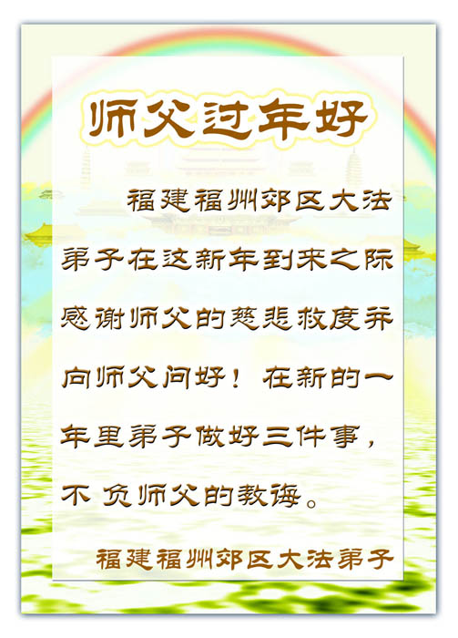 我们将在新的一年里更加精進实修,认真的做好三件事,救度众生,不辜负师尊的慈悲苦度。 江苏省淮安市全体大法弟子敬上 二零零九年一月十六日 福建福州郊区大法弟子恭祝师父新年好!