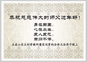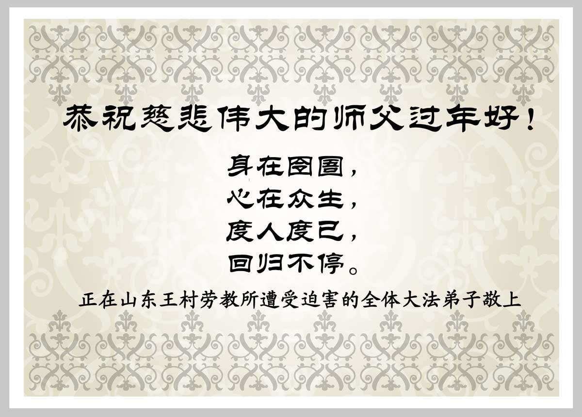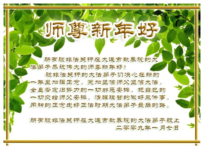 大连市监狱、看守所,劳教所中等所有被非法关押的大法弟子给师父拜年!弟子们坚决信师信法,了却人心。在新的一年里要更加清醒理智的做好师父交给的三件事,用神的正念走好最后的路。 大连市所有被非法关押的大法弟子敬上 二零零九年一月七日 正在山东王村劳教所遭受迫害的全体大法弟子恭祝师父过年好!