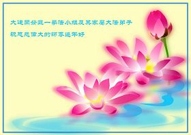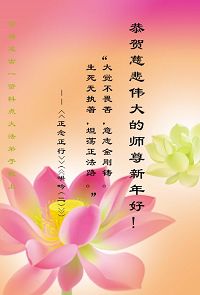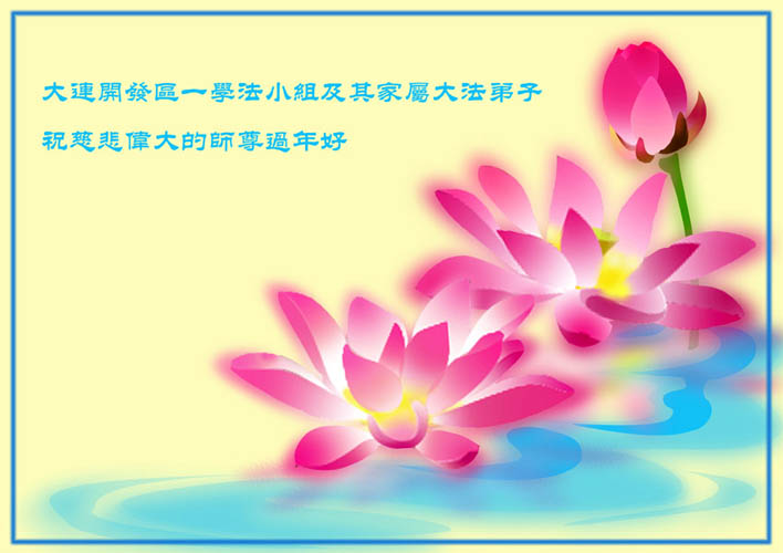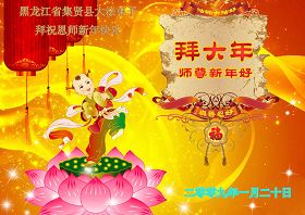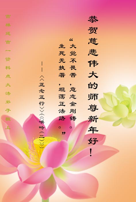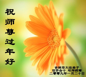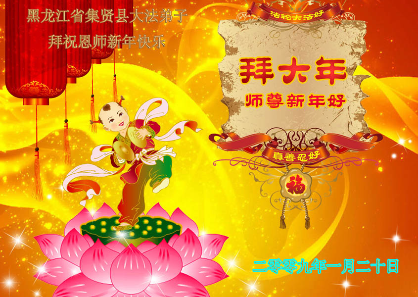 【明慧网二零零九年一月二十六日】大连金山区大法弟子恭祝师尊过年好!大兴安岭地区、新林区、大乌苏大法弟子敬贺师尊过年好!长春大法弟子给伟大的师尊拜年长春大法弟子恭祝伟大的师尊过年好!家乡大法弟子想念您。我们一定做好三件事,不辜负师尊的期望。 2009年1月20日 沈阳大法弟子向师父问好,恭祝慈悲伟大的师尊新年快乐!长春大法弟子给师尊拜年!师尊过年好!在新的一年,全体大法弟子会更加清醒,理智,稳健的做好三件事,遵师言“讲清真相这件事情一定要做,而且一定要做到底”。使更多的众生得救。在法上提高,形成整体,跟上正法進程,为众生开创未来,做堂堂正正的助师正法的大法弟子! 长春大法弟子 二零零九年一月九日 吉林延吉一资料点大法弟子恭祝师尊过年好!黑龙江肇州县全体大法弟子敬祝慈悲伟大的师尊过年好! 肇州县全体大法弟子给师父拜年!望早日和师尊团聚!肇州县全体大法弟子合十 于戊子年腊月廿四日 佳木斯老年大法弟子恭祝师尊新年快乐!黑龙江佳木斯一学法小组大法弟子恭祝师父过年好!鞍山全体大法弟子恭祝慈悲伟大的师尊新年快乐!吉林市大法弟子祝师父过年好!黑龙江省集贤县大法弟子拜祝师父新年快乐!沈阳大法弟子给师尊拜年!我们是沈阳大法弟子,在己丑到来之际,远隔重洋叩拜师尊:师尊您过年好!师尊您辛苦了!弟子想念您!弟子一定按师尊要求做好三件事,信师信法坚如磐石,精進实修,完成史前誓约,随师尊回家,请师尊放心! 佳木斯大法弟子新年问候师父大连开发区一学法小组及家属大法弟子祝慈悲伟大的师尊过年好辽宁省熊岳大法弟子祝师尊过年好哈尔滨道里区学法小组全体大法弟子祝福师父新年快乐!慈悲伟大的师尊您好!我们学法小组的全体大法弟子在新年即将到来时,向慈悲伟大的师尊衷心的祝福新年快乐!请师尊放心,弟子牢记师尊教给弟子的向内找的法宝,修去执著和各种人心,无论今后的路多么艰难,弟子都要按照师尊的要求,做好三件事,勇猛精進,决不辜负师尊的慈悲苦度,圆满跟师尊回家。 哈尔滨道里区学法小组全体大法弟子 二零零九年一月五日 延吉市全体大法弟子祝师父新年好辽宁鞍山千山区全体大法弟子恭祝慈悲伟大的师尊过年好!师尊辛苦啦!在这辞旧迎新的时刻,我们千山区全体大法弟子想念师父。此时此刻,我们的心情无法表达对师父苦度的感激之情,也无以回报。我们只有做好师父要求的三件事,正念正行,努力救度一切可救度的众生,兑现史前大愿。请师父放心,我们一定能够做到,也一定能做好。 鞍山千山区全体大法弟子叩拜 盘锦市盘山县大法弟子祝贺师父新年好我们全家祝贺慈悲伟大的师父及家人过年好!谢谢师父的救度之恩。 盘锦市盘山县大法弟子 佳木斯一家庭资料点大法弟子恭祝慈悲伟大的师父过年好!在这辞旧迎新的伟大时刻,我们非常想念远在海外的给予我们无限恩泽大法的师父,此时,谨以笔墨传递我们的感恩与祝福!我们向师父鞠躬,合十,跪拜。其实世间的任何形式和语言都无法表达出我们对师尊的敬仰,更无法准确形容我们师尊的伟大。 在这千载难逢,万古不遇的大法洪传之时,我们能成为助师正法的一粒子,深感无比荣幸和自豪。请师尊放心,在这苍穹从组,万物更新的伟大时刻,我们一定努力完成救度众生的使命,不辜负师尊的慈悲苦度。 佳木斯一家庭资料点大法弟子敬上 二零零九年一月二十一日 锦州大法弟子给恩师拜年弟子跪拜恩师,向师父拜年。 问候师父新年好、师父辛苦了、祝师父新年快乐。 请师父放心,弟子听您的话,大法铭刻心中。 做好三件事,做一个够标准的正法时期的大法徒。 谢谢师父的慈悲苦度。 锦州大法弟子 吉林市资料点全体大法弟子问候师尊新年好!在伟大师尊的呵护下,我们在邪恶的环境下又走过了一年,跌倒爬起,每一步都浸透着伟大师尊的心血。在新年到来之际,我们倍加思念师尊,只有在以后有限的时间里勇猛精進,学法修心,全身心的做好三件事,更多的救度众生来回报师恩。 吉林市资料点全体大法弟子叩拜师尊 哈尔滨市大法弟子恭祝慈悲伟大的师尊新年快乐!弟子们一定不辜负师父的救度之恩,做好三件事,走正师父安排的路,随师父回家。 哈尔滨市大法弟子 2009—1—21 哈尔滨市道里区学法小组大法弟子恭祝慈悲伟大的师尊新年快乐!弟子们一定不辜负师父的救度之恩,修好自己,救度更多的众生,做好三件事,走师父安排的路,圆满随师父回家。 哈尔滨市道里区学法小组大法弟子 2009—1—21 佳木斯北方机械厂部份中老年学法小组大法弟子恭祝伟大的师尊新年快乐!师尊:我们想念您,师尊辛苦了。请师尊放心,我们一定彻底解体邪恶,救度世人,随师正法做好三件事。 佳木斯北方机械厂部份中老年学法小组敬上 2009年1月16日 大连一家庭资料点全体大法弟子恭祝慈悲伟大的师父新年快乐!师父,新年佳节即将到来,弟子们想念您啊!此时,徒儿泪如泉涌,不知如何表达对您的感恩。千言万语也说不尽您的浩荡师恩。惟有精進。 在新的一年里,弟子们一定更加精進,学好法,放下一切执著,圆满完成救度众生的历史使命,跟师父回家! 大连一家庭资料点全体大法弟子叩首敬上 长春市绿园区学法小组和一家三代祝慈悲伟大的师尊过年好弟子们想念师尊,千言万语也无法表达对师尊洪大慈悲的感恩!师尊放心,弟子们一定多救度众生,