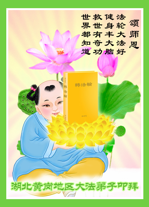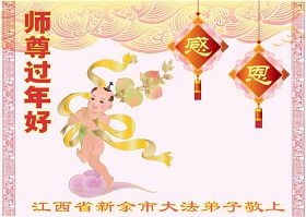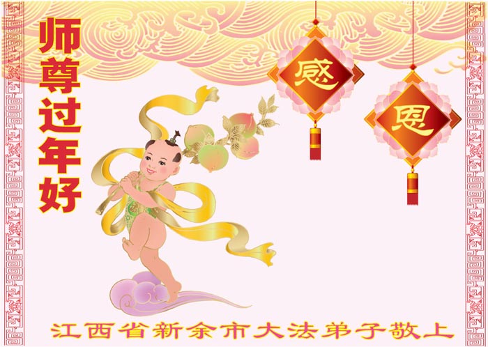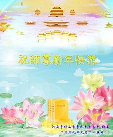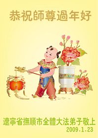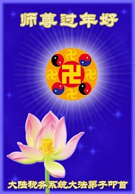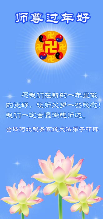 【明慧网二零零九年一月二十八日】河南平顶山市市区大法弟子给师尊拜年:祝慈悲伟大的师父新年快乐!河北税务系统大法弟子恭祝师尊新年好!师父过年好!愿我们在新的一年里做的更好,让师父多一些欣慰!我们一定会圆满随师还。 全体河北税务系统大法弟子叩拜 湖北黄冈地区大法弟子恭祝师尊新年好!长春一大法弟子恭祝师尊新年快乐慈悲、伟大的师尊:新年好! 我悟性差,感念师尊九年来不舍弟子的慈悲苦度,深感佛恩浩荡,使弟子逐渐从后進赶上师尊的正法進程,在正法的最后阶段,我愿舍尽人心、同化大法、坚定实修、与同修配合好、救众生于水火,唯愿师尊笑。 长春一大法弟子向师尊顶礼 万年历戊子年除夕 江西省新余市大法弟子恭祝慈悲伟大的师父新年好!辽宁省抚顺市全体大法弟子恭贺师尊过年好!抚顺市教育系统全体大法弟子恭贺师父过年好!大陆税务系统大法弟子恭祝慈悲伟大的师尊过年好!请师父放心,在新的一年里,我们会精進做好“三件事”,我们一定更加专业、更有效率的抓紧救度众生! 全体大陆税务系统大法弟子叩首 河北宣化大法弟子祝师父过年好我们一定听师父的话,坚持走好以后修炼的路。 大连大法弟子恭祝师尊新年好!师恩难报,唯有精進。 大连学法小组大法弟子 河南郑州恭祝伟大师父新年快乐!洪微坏灭时,主佛转法轮。 众生喜得度,十方世界新。 穷尽世间语,难诉师尊恩。 又逢佳节至,盼师泪沾襟。 万里不尽言,遥寄一片心。 精進不懈怠,同化真善忍。 郑州大法弟子敬上 二〇〇九年一月二十四日 宁夏中卫大法弟子遥祝伟大的师尊过年好!在这新年即将来临之际,我们朝阳郊区全体大法弟子向伟大的师尊拜年:师尊新年好!在正法最后时刻,弟子一定遵照师尊教诲做好三件事,不负师望,完成史前大愿,跟师父回家! 陕西省建材行业全体大法弟子向伟大的师尊致以崇高的敬意!祝师父新年快乐!绥化市教育界大法弟子祝师尊新年快乐在新年到来之际,绥化市教育界大法弟子向师尊问好,祝伟大的师尊新年好,感谢师尊的慈悲苦度,我们会努力做好跟上师尊的正法进程。 二零零九年一月二十四日 。 广东揭阳市全体大法弟子向慈悲伟大的师尊拜年,恭祝师尊过年快乐!砀山县大法弟子新年贺辞值此新年来临之际,谨向慈悲伟大的师尊致以诚挚的问候,谨祝师父新年好!在修炼路上,弟子将奋起直追,找出修炼中的不足,正念正行,做好三件事,助师正法行! 向师父合十! 向全世界大法弟子合十! 砀山县大法弟子 20090123 山东乳山全家大法弟子给师父拜年!恭祝慈悲伟大的师父新年快乐!在新的一年里,我们会修去各种人心,努力做好三件事! 二零零九年一月二十四日 广东肇庆学法小组、高要资料点大法弟子祝我们伟大师尊新年快乐。河北省永清县全体大法弟子恭祝慈悲伟大的师父新年快乐!舒兰市全体大法弟子向师尊拜年!我们在新的一年里一定严格要求自己无条件的向内找,做好三件事,让师尊多一份欣慰,少一份操劳。 河北沧州全体大法弟子向伟大的师尊问候,祝师尊过年好!在新的一年里,我区大法弟子努力做好三件事,在有限的时间里多救人,完成历史使命,圆满随师还。 广西大法弟子恭祝师尊新春快乐!一流落他乡的大法弟子恭祝师尊新年祥安!快乐!师尊啊!弟子想念您!在弟子走向神路上的这十一年里,无时无刻不感受到师尊的慈悲苦度与精心呵护,弟子有时修的很不好,甚至做过对不起师父的事,让师父操尽了心,师父没有嫌弃我,用无量的慈悲引领着弟子一步步走好!弟子修炼法轮大法的这十一年里,曾三次遇到危急情况(被汽车撞倒在地),然而三次安然无恙,都是师父保护了我,弟子的命是师父给的啊!弟子信师信法坚如磐石!请师尊放心,在正法修炼的最后时期,我一定做好三件事,听师父的教诲:“用理智去证实法、用智慧去讲清真相、用慈悲去洪法与救度世人”《理性》。 一流落他乡的大法弟子叩拜 辽宁省清原大法弟子一家三口给师尊拜年:师父过年好!祝愿师父新年快乐!广州大法弟子向慈悲伟大的师尊问新年好!请师尊放心,在新的一年里,我们广州大法弟子一定会做好三件事,不辜负师尊的慈悲苦度!祝师尊新年快乐! 山东烟台芝罘区全体大法弟子恭祝慈悲伟大的师尊大年快乐!慈悲伟大的师尊: 过年好!师尊辛苦了!弟子们想念师尊!请师尊放心!我们定会做好大法弟子该做的事,完成史前大愿,圆满随师还。谢谢师尊! 山东烟台芝罘区全体大法弟子合十叩拜 二零零八年腊月二十九日 大连开发区大法弟子恭祝师尊新年好在新的一年里我一定要更加精進,不辜负师尊的慈悲苦度。 内蒙古克一河、甘河大法弟子祝伟大的师尊新年快乐!四川雅安地区全体大法弟子恭祝慈悲伟大的师尊新年快乐!陕西汉中全体大法弟子恭祝师父新年愉快!河北秦皇岛石门寨全体大法弟子恭祝师尊新年快乐!浙江省大法弟子祝贺师父农历新年快乐!紧跟师父,努力做好三件事!中国建设银行系统全体大法弟子恭祝师尊新年快乐!中国卫生系统全体大法弟子恭祝师尊新年快乐!四川绵阳市全体大法弟子给师尊拜年!恭祝师尊过年好!湖南省郴州市全体大法弟子恭祝师尊新年快乐!兰州大法弟子恭祝慈悲伟大的师尊新年好。师尊您辛苦了。秦皇岛市一5人学法小组跪拜慈悲伟大的师父:过年好!师父:我们想念您!我们无法用任何语言表达您为我们承受的一切,在新的一年里,唯