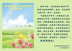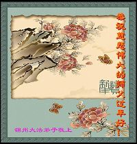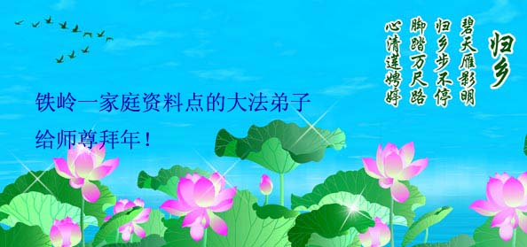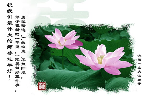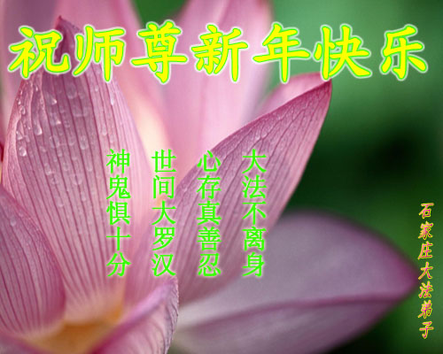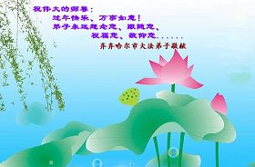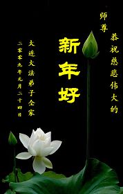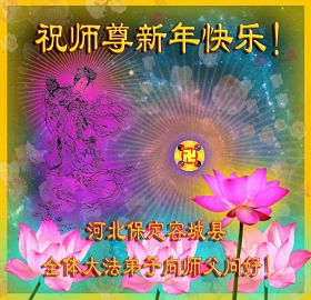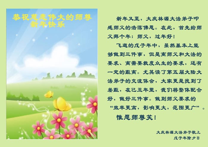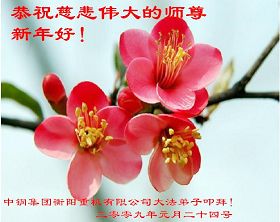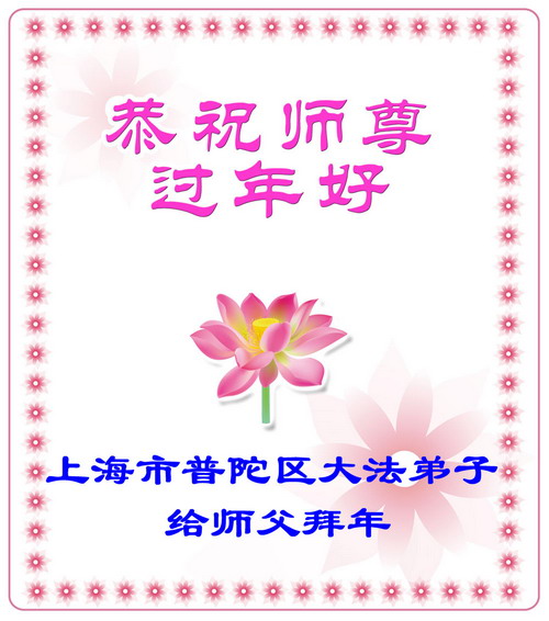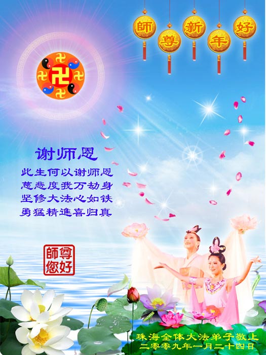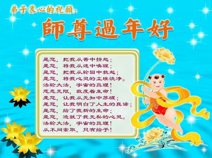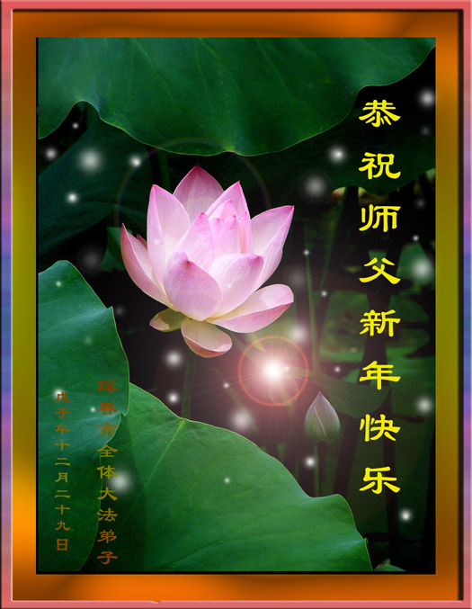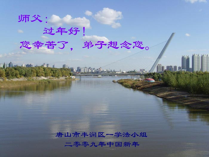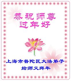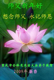 【明慧网二零零九年一月二十八日】山东昌邑全体大法弟子恭祝师尊新年快乐!锦州大法弟子恭祝慈悲伟大的师尊过年好!珲春全体大法弟子恭祝师父新年快乐沈阳一家大法弟子恭祝最伟大的师尊过年好!安徽安庆家庭学法点大法弟子敬祝师父新年快乐!湖北黄石大法弟子向师父拜年!恭祝师父新年快乐!石家庄大法弟子恭祝师尊新年快乐!大陆一大法弟子全家恭祝师尊新年快乐!湖北十堰全体大法弟子给师尊拜年!恭祝师尊过年好!大陆大法弟子恭祝师尊过年好!大庆大法弟子恭祝慈悲伟大的师尊新年快乐!辽宁凤城流离失所大法弟子恭祝师尊新年快乐!湖北黄石大法弟子恭祝师父新年快乐!广东东莞大法弟子恭祝尊敬的师父新年好!全体辽宁东港大法弟子恭祝师尊新年快乐!邯郸大法弟子及家人恭祝师尊新年快乐!冠县大法弟子恭祝师尊新年快乐!黑龙江大庆大法弟子恭祝慈悲伟大的师尊过年好!湖北黄石大法弟子恭祝师父新年快乐!浙江大法弟子恭祝伟大的师尊新年快乐!哈尔滨道里区学法小组大法弟子恭祝伟大的师尊新年好!全体大连大法弟子恭贺师尊过年好!辽宁本溪全体大法弟子恭祝慈悲伟大的师尊过年好!杭州大法弟子感谢师父慈悲苦度!恭祝伟大的师尊新年好!山西霍州大法弟子恭祝慈悲伟大的师尊新年快乐!吉林榆树市大法弟子敬祝慈悲伟大的师尊过年好!河北保定蠡县全体大法弟子给师父拜年!河北保定博野全体大法弟子给师父拜年!甘肃金昌、河北秦皇岛、广东珠海、深圳大法弟子恭祝师父新年快乐!东营市胜利油田孤岛地区大法弟子恭祝慈悲伟大的师尊新年好!兰州大法弟子恭祝伟大的师尊过年好!弟子思念师尊!吉林农安大法弟子恭祝师尊新年快乐!大陆七位大法弟子恭祝师尊新年好!双城大法弟子恭祝师尊新年快乐!大陆大法弟子恭祝师尊新年快乐!黑龙江双鸭山市全体大法弟子恭祝师尊新年好!黑龙江双鸭山市全体大法弟子恭祝师尊新年好!齐齐哈尔大法弟子恭祝伟大的师尊过年快乐!湖北黄石大法弟子恭祝师父新年快乐!大陆法院系统大法弟子向师父拜年!师父过年好!辽宁朝阳教育系统大法弟子恭祝师尊新年快乐!潍坊流离失所的大法弟子恭祝慈悲伟大的师父新年快乐!保定全体大法弟子恭祝师尊新年快乐!锦州大法弟子恭祝慈悲伟大的师尊新年快乐!伊春市、铁力流离失所大法弟子恭祝师尊新年好!弟子一定不负师尊慈悲苦度,走正走好最后救度众生之路。愿师尊少一份辛劳,多一份欣慰。 铁岭一家庭资料点大法弟子给师尊拜年!北京昌平大法弟子敬祝师尊新年好!北京海淀大法弟子恭祝师尊新年好!潍坊大法弟子恭祝师尊牛年快乐!吉林四平全体大法弟子恭祝慈悲伟大的师尊过年好!郑州大法弟子恭祝慈悲伟大的师尊新年好!哈尔滨香坊区大法弟子恭祝师尊新年快乐!双城大法弟子恭祝师尊新年快乐!广东茂名市茂港区坡心镇全体大法弟子恭祝师尊新年好!安徽黄山大法弟子祝师尊新年好!新年来临,安徽黄山全体大法弟子祝师父新年好! 弟子们紧随师父,做好三件事,广传真相,救度众生,完成史前大愿。 天津市大法小弟子恭贺师父新年快乐!河北遵化大法弟子恭祝师尊新春快乐云南昆明市大法弟子恭祝师尊过年好沈阳辽中全体大法弟子给师尊拜年!湖南省衡阳市全体大法弟子恭祝慈悲伟大的师尊新年快乐!浙江台州大法弟子恭祝师尊新年快乐中钢集团衡阳重机有限公司大法弟子恭祝师尊新年快乐!黑龙江省讷河市的一个修炼家庭恭贺师父过年好!我和我的一对双胞胎儿子(小弟子)谢谢师父的慈悲救度,我们会比学比修,修好自己跟师父回家的。 黑龙江省讷河市的一个修炼家庭 二零零九年一月二十四日 湖南衡阳市雁峰区大法弟子祝师尊过年好杭州萧山大法弟子祝师尊新春快乐山东莒县大法弟子全家祝伟大的师尊新年快乐!全家三代七口向慈悲伟大的师父拜年值此我们中华民族的传统新年,我们全家三代七口向慈悲伟大的师父拜年。愿师父多一份欣慰,少一份操劳。 重庆市受迫害大法弟子给师父拜年唐山市丰润区一学法小组大法弟子恭祝师父新年好章丘大法弟子恭祝师尊新年快乐哈市浓河镇大法弟子祝师尊新年快乐浙江临海市全体大法弟子恭祝慈悲伟大的师尊过年好!北京航天部二院大法弟子祝师父新年快乐!上海市普陀区全体大法弟子向师父拜年上海市普陀区全体大法弟子向伟大至尊的师父拜年,在新的一年里,我们要全心全意的做好三件事,完成好各自的史前大愿,助师世间行! 河北保定容城大法弟子祝师尊新年快乐!江门大法弟子给师父拜年,感谢师父慈悲救度之恩!山西临汾全体大法弟子恭祝慈悲伟大的师尊新年快乐!请师父放心我们一定要做好三件事! 四川省大竹县全体大法弟子恭祝慈悲伟大的师父新年快乐请师父相信我们一定会做好三件事,我们一定会更加勇猛精進,兑现我们的誓言! 鞍山市一家四口大法弟子恭祝慈悲伟大的师父过年好山西大同大法弟子问师尊过年好!慈悲伟大的师尊过年好! 每逢佳节倍思亲,此时此刻,师尊虽和我们远隔重洋,但我们对师尊的感恩之情难以言表,师恩浩荡!浩荡师恩!多救人,做好三件事,决不辜负师尊对我们的慈悲苦度! 弟子跪拜! 山西大同大法弟子 2009-01-24 重庆市江北区全体大法弟子祝慈悲伟大的师父过年好!新的一年,弟子会更加努力,更加努力的学好法,修好自己,做好师父交代的三件事,救度更多的