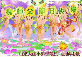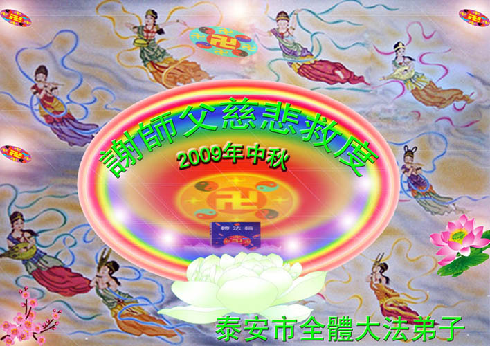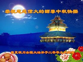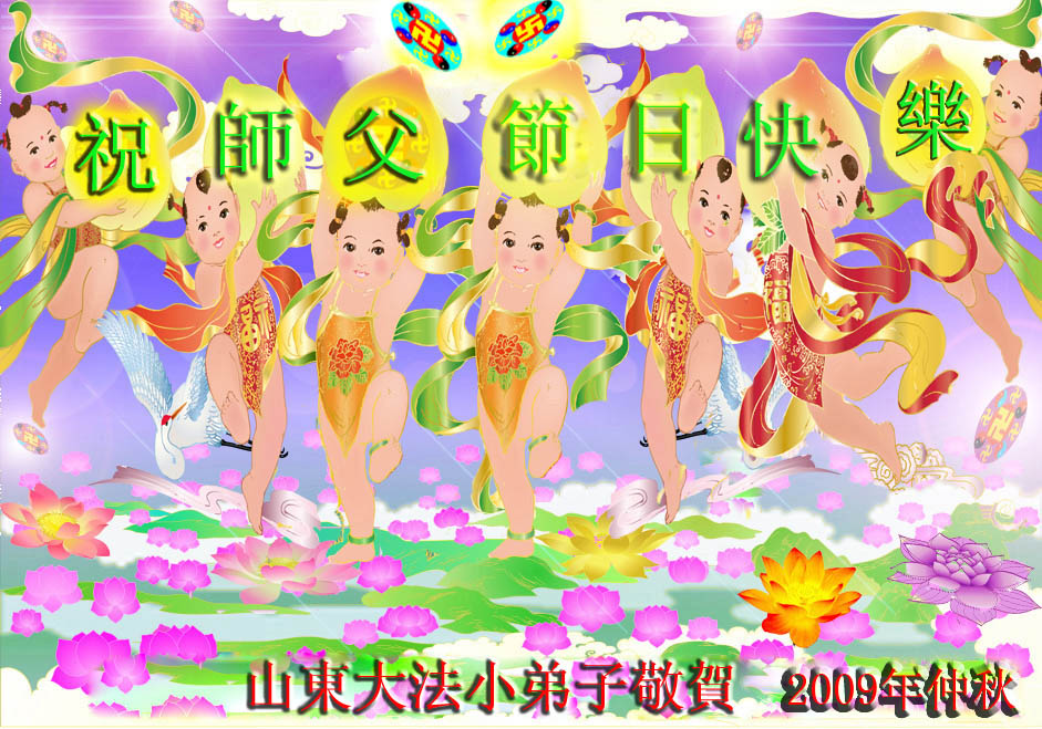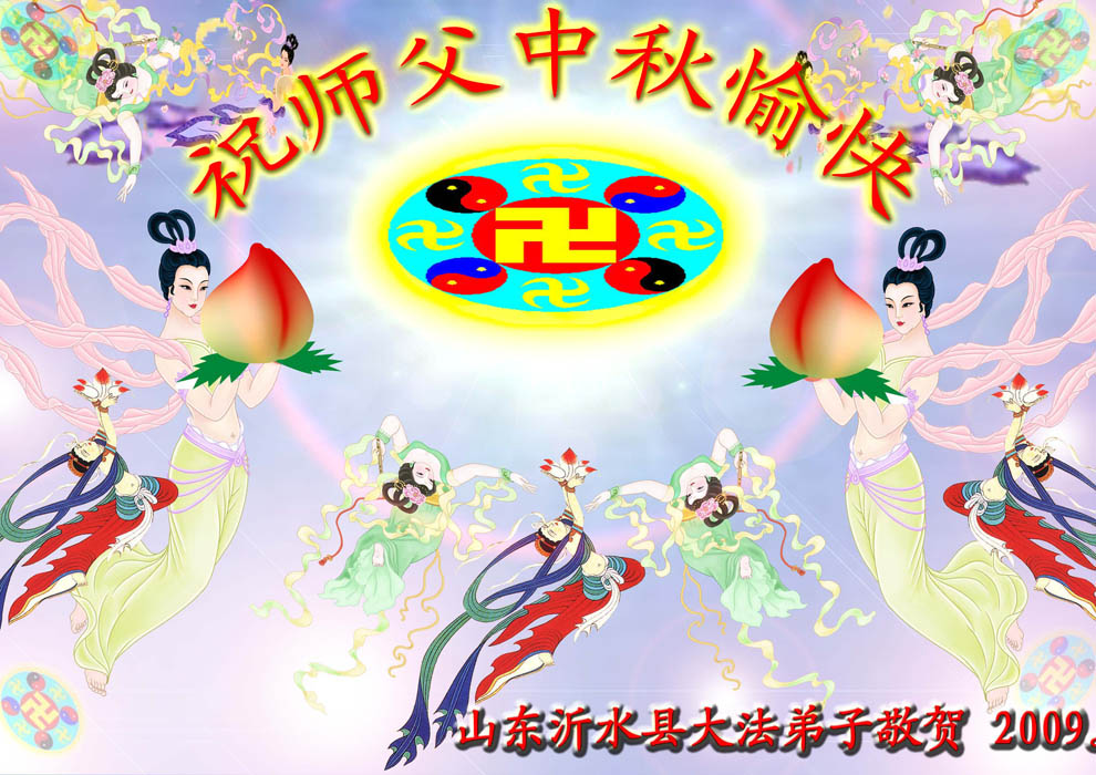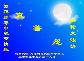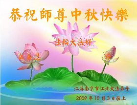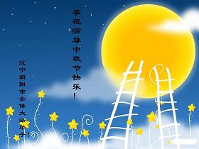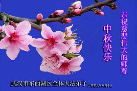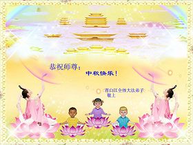 【明慧网二零零九年十月二日】湖北荆门全体大法弟子恭祝师尊中秋节快乐!在有限的时间里我们一定做好三件事,圆满随师还。 辽宁金城全体大法弟子恭祝慈悲伟大的师尊中秋节快乐!师父中秋节好!借此中秋节来临之日,向慈悲伟大的师尊致以最崇高的敬意和节日的问候:师尊您好!师尊您辛苦了!谢谢师尊的慈悲苦度!请师尊放心,在以后不多的时间中我们一定要做好“三件事”,圆容师尊想要的,兑现史前大愿。共同迎接普天同庆的那一天。 金城全体大法弟子叩拜合十敬上 抚顺地区全体大法弟子恭祝慈悲伟大的师尊中秋节快乐!中秋佳节即将到来,我们抚顺地区全体大法弟子向慈悲伟大的师尊致以节日的问候:“师父好!您辛苦了!弟子想念您!”弟子们感谢师父的慈悲苦度和佛恩浩荡,我们一定用修好自己、助师正法、救度更多众生的行动来向您汇报。我们全体大法弟子更要勇猛精進,做好三件事,走好走正最后修炼的道路,不辜负师父的慈悲苦度。愿我们的成熟永远不再让恩师操劳!祝愿师尊中秋快乐! 抚顺地区全体大法弟子 二零零九年九月二十三日 全体烟台大法弟子恭祝师尊中秋快乐!武汉市全体大法弟子恭祝师尊中秋快乐!武汉市东西湖区全体大法弟子恭祝慈悲伟大的师尊中秋快乐!江苏南京市江北大法弟子恭祝师尊中秋快乐!师尊好!又是一年的中秋佳节,弟子们祝师尊中秋快乐!我们将尽全力学好法,修好自己,大面积的救度众生,共同精進,走好最后的路,不负师尊的慈悲苦度! 山东沂水县大法弟子祝师父中秋愉快!犍为县大法弟子祝师尊中秋节快乐!辽宁省鞍山市一家庭资料点恭祝慈悲伟大的师尊中秋节快乐!弟子想念师尊,期盼能早日与师尊相见!在今后证实法的日子里,弟子会越来越成熟、理智、稳步的走正、走好师尊给安排的路,做好三件事的同时修好自己。愿师尊少一份操劳,多一份欣慰。 双流县学法小组大法弟子恭祝师尊中秋节快乐!双流县全体大法弟子祝师尊中秋节快乐!延吉大法弟子恭祝师尊中秋快乐辽宁朝阳市大法弟子恭祝师尊中秋快乐大庆大法弟子恭祝师尊中秋节快乐!辽宁省建平县全体大法弟子恭祝伟大的师尊中秋节快乐!泰安市全体大法弟子谢师父慈悲救度!内蒙古通辽市大法弟子恭祝师尊中秋节快乐!山东淄博沂源大法弟子祝师尊中秋快乐!烟台大法弟子恭祝师尊中秋节快乐十堰市全体大法弟子恭祝师尊中秋快乐!佳木斯四人学法小组全体大法弟子恭祝师尊中秋快乐!我们小组, 四名弟子。 大法经书, 系统学习。 认真阅读, 法理清晰。 虚心内找, 修炼自己。 比学精進, 升华整体。 时时正念, 坚如磐石。 助师正法, 救人积极。 功成圆满, 幸福无比。 佳木斯四人学法小组 全体大法弟子 2009年9月 长春大法弟子祝师尊中秋快乐!长春大法弟子恭贺师尊中秋节节日快乐!吉林大学大法弟子恭祝师尊中秋快乐!山东烟台市福山区大法弟子恭祝师尊中秋快乐长春全体大法弟子祝师尊中秋佳节快乐!长春大法弟子恭贺师尊中秋节节日快乐!吉林省洮南市全体大法弟子 长春市永安厂全体大法弟子 吉林大学全体大法弟子 吉林农业大学全体大法弟子 东北师范大学全体大法弟子 长春市全体大法弟子 长春市全体大法小弟子 2009年9月18日 广东大法弟子恭祝无上师尊己丑年中秋快乐!师尊在上: 中秋佳节之际,弟子向无量恩师致以最最深挚的问候,并向师尊表示:一定“坚修大法紧随师”,继续努力做好三件事,学好法去人心走正路,助师正法,救度众生。在此代表被邪恶非法关押迫害的弟弟向师尊问好(他往常每逢佳节总是早早做好精美图片发往明慧向师尊致意),同时代八十多岁的父母(大法弟子)向师尊问好。 广东弟子叩拜 二零零九年九月十九日 齐齐哈尔市铁路全体大法弟子祝师父中秋节快乐!青白江区全体大法弟子恭祝师尊中秋快乐!彭山全体大法弟子问候慈悲伟大的师父中秋节日好!绵阳大法弟子及亲属恭祝师尊中秋快乐!中秋节到来之际,衡水全体大法弟子向慈悲伟大的师尊致以节日的问候我们一定不辜负师尊的慈悲苦度,更加精進,做好三件事。唯愿师尊少一份操劳,多一份欣慰! 全体衡水大法弟子 2009年9月20日 山东乳山大法弟子一家恭祝伟大师父中秋节好!大庆市西城区大法弟子祝慈悲伟大的师尊中秋快乐!寄语师尊的中秋问候!祝慈悲伟大的师尊中秋快乐! 祥云淡淡酝中秋 感恩师尊慈悲度 祥云难载敬师意 弟子叩拜师尊好 大庆市西城区大法弟子 二零零九年九月二十六日 大庆市龙南大法弟子向师尊的中秋问候值此中秋佳节祝师尊中秋快乐!中秋是中华各民族的传统节日,是华夏子孙大团圆的日子,大陆大法弟子盼望早日与师尊团聚。弟子一定牢记师尊的谆谆教诲,努力学好法;发好正念,讲清真相救度众生,不辜负师尊的期望和众生的重托。我们一定形成整体,完成好大法弟子助师正法,救度众生的历史使命。 大庆市龙南大法弟子 二零零九年九月二十六日 天津大法弟子恭祝师尊中秋快乐!正法洪势迅猛的向前推進,特别是学习了师尊近期的几次讲法,弟子深感在助师正法中的历史重任与在一切环境中修好自己的严肃性,也找到了我们修炼中的差距。请师尊放心:在这最后的路上,我们一定会认真,努力的学好法,在做好三件事的过程中,坚持正念正行,不被常人社会的一切所带动,走正自己脚下的路。给自己争气,为师尊争光。叩拜谢师恩。 天津大