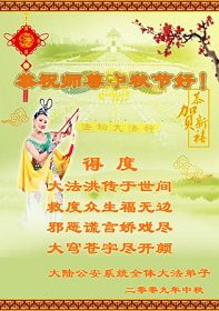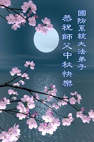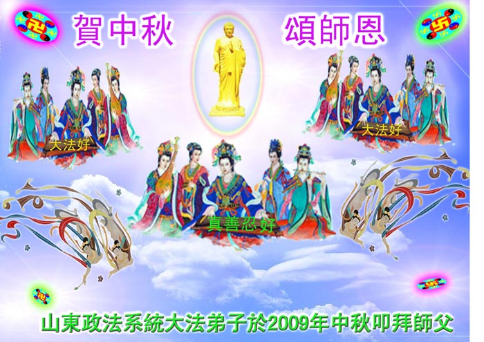 【明慧网二零零九年十月三日】国防系统大法弟子恭祝师父中秋快乐!北京总参大法弟子恭祝慈悲伟大的师尊中秋快乐!大陆全体法官大法弟子恭祝师尊中秋节快乐!慈悲伟大的师尊: 您辛苦了。大陆全体法官大法弟子恭祝师尊中秋节快乐!师恩浩荡,弟子无以为报。弟子一定在修炼好自己的同时,助师正法,用慈悲救度更多的世人,做好大法弟子应当做好的三件事,决不辜负师尊的慈悲苦度。谢谢慈悲伟大的师尊!! 大陆全体法官大法弟子 二零零九年九月二十日 山东司法系统大法弟子恭祝师尊中秋快乐!师父您辛苦了!师恩难报!我们会更加精進的做好三件事,不负师尊苦度,不负自己的史前誓约,不负众生的期盼,救度更多的众生,让师尊多一些欣慰。 恭祝师尊中秋快乐! 二零零九年九月二十九日 大陆警察大法弟子恭祝师尊中秋节快乐!军队系统大法弟子恭贺师尊中秋节快乐!师尊: 您好! 我们军队系统大法弟子非常非常的想念您,我们衷心的恭贺您中秋节快乐!我们身在邪恶的军营,深知救人的艰难,但是请师尊放心,我们坚定的伩师伩法,坚定的走您安排的路,努力做好三件事,决不辜负您的慈悲苦度。 军队系统大法弟子 09—09—24 长治市军队干修所大法弟子二零零九年中秋叩拜师尊!山东政法系统大法弟子祝大慈大悲的师父中秋快乐!至尊至上的师父啊,回想着您多年的正法路,泪水啊,再一次洒满胸前。有谁能知道您付出的心血?有谁能知道您承受的一切?是您力挽狂澜,救度苍穹在坏灭的瞬间。看那金色的法船,满载着众生驶向彼岸,大法的光辉永远照耀在苍宇间! 万物苍生叩谢师父救度之恩! 武警部队复退转业的大法弟子向慈悲伟大的师尊问好:恭祝慈悲伟大的师尊中秋快乐!石家庄市委市政府大法弟子恭祝师尊中秋佳节快乐!中国人民防空系统大法弟子祝贺师尊中秋佳节好!祝贺师尊中秋佳节快乐! 弟子一定利用一切有利条件证实好法,学好法、做好三件事,抓紧救度众生。 中国人民防空系统大法弟子 2009-09-28 大连驻军全体大法弟子恭祝师尊节日快乐!大陆公安系统的全体大法弟子恭祝师尊中秋节好! |