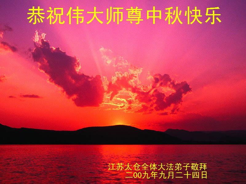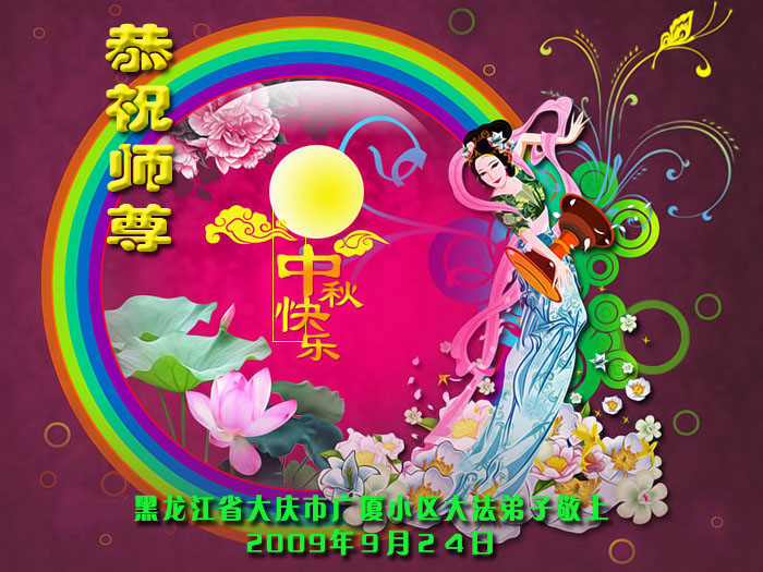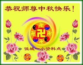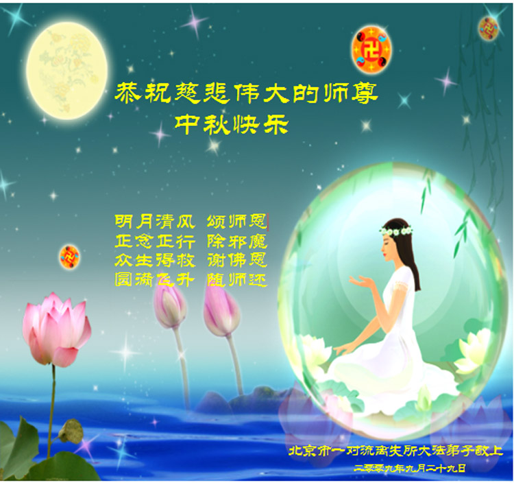 【明慧网二零零九年十月三日】黑龙江省大庆市广厦小区大法弟子恭祝师尊中秋快乐!北京东城大法弟子祝师父中秋节快乐!我们坚修大法,广救众生,兑现史前大愿,圆满随师还。 江苏太仓娄江大法弟子敬祝最伟大的师尊中秋快乐!您的教诲铭记心中,救度世人。修好自己,兑现史前洪愿,圆满随师还。 江苏太仓娄江大法弟子 二零零九年九月二十五日 北京西城大法弟子祝师父中秋节快乐!承德大法弟子祝师父中秋节快乐!贵州大法弟子祝伟大的师尊中秋节快乐水调歌头 修炼莫言苦, 大法重修心。 遇师有幸得度, 无言谢师恩。 红魔谣言四起, 邪灵机关算尽, 妄想毁生灵。 正念除邪恶, 正法随师行。 传《·九·评*》, 劝三:退., 救迷人。 修心去执, 坚信念返本归真。 闻法众生得救, 晓理人生有福, 大法正乾坤。 万众普天庆, 永古大穹新。 (贵州大法弟子小海) 云南楚雄全体大法弟子,小弟子向慈悲伟大的师尊问好,恭祝师尊中秋快乐!全体梁山县大法弟子叩拜师尊,敬祝慈悲伟大的祝师父中秋快乐!师尊您好! 每逢佳节倍思亲 又到中秋月圆时 全体梁山县大法弟子叩拜师尊,敬祝慈悲伟大的祝师父中秋快乐! 中秋节广州俩大法弟子向尊敬的恩师问好!尊敬的恩师您好! 值此中秋节之际,弟子在此向恩师合十、叩拜! 祝愿尊敬的、伟大的、慈悲的恩师中秋节快乐! 祝愿全世界的大法弟子们中秋节快乐! 广州俩大法弟子叩拜 沈阳市法库县大法弟子恭祝慈悲伟大的师尊中秋快乐!弟子们一定要做好师父要求的三件事,救度更多的众生。 法库县全体大法弟子 二零零九年九月三十日 沈阳市康平县大法弟子恭祝慈悲伟大的师尊中秋快乐!衡阳市蒸湘区大法弟子恭祝师父中秋节快乐!感谢师父的慈悲苦度,我家三人全部得法修炼。 值中秋佳节之际,恭祝师父中秋节快乐! 衡阳市蒸湘区大法弟子敬上。 天津大法弟子恭祝师尊中秋节快乐!敬请师尊放心!弟子会做好“三件事”的,救度更多的众生。 天津大法弟子——心正 叩拜敬上! 乙丑年八月十二日 佳城大法弟子恭祝师尊 中秋快乐同修弟子法中缘, 集体学法天天见。 法中升华心相连, 纯真状态环境变。 助师救人要慈善, 忍让内找真修炼。 真善忍、是标准, 勇猛精進就圆满。 佳城大法弟子 2009、9、29、 佳城大法弟子恭祝师尊中秋快乐大法法无边, 与谁都有缘。 人世时间短, 珍惜这时间。 大法普度人, 快快上法船。 难得万古缘, 不能留遗憾。 佳城大法弟子 2009、9、29、 佳城一小资料点恭祝师尊 中秋快乐万花丛中一小花, 严寒酷暑都不怕。 开在大法弟子家, 师尊甘露浇灌她。 芳香四溢证实法, 众生心灵受启发。 纷纷退出邪恶党, 宝贵生命已留下。 佳城一小资料点 2009、9、29、 佳城大法弟子恭祝伟大师尊 中秋快乐零九中秋不一般, 法正乾坤整十年。 众生得救邪恶完, 大千世界换新颜。 大法弟子心里甜, 神在人中送温暖。 众生退出党团队, 吉祥幸福在眼前。 佳城大法弟子 2009、9、29、 北京市一对流离失所大法弟子恭祝师尊中秋快乐明月清风 颂师恩 正念正行 除邪魔 众生得救 谢佛恩 圆满飞升 随师还 北京市一对流离失所大法弟子 二零零九年九月二十九日 山东省胶州市李哥庄镇全体大法弟子恭祝师尊中秋节快乐弟子们定会学好法,排除干扰,彻底否定旧势力因素的安排,更加稳健的走好每一步,救度众生,做好三件事。 向师尊合十 山东省蒙阴县大法弟子一家八口恭祝师父中秋节快乐又是中秋佳节到,我们隔洋遥拜师父中秋快乐。 相似的问候不一样的心情,怎么样给师父写问候语总成为我们向内找的交流点:我们做的怎么样做到修炼人的标准了吗?去年的承诺我们做到了吗?…… 同时感谢明慧的同修,感谢明慧网这样一个平台,给所有大法学员一个交流切磋的空间。 祝明慧同修中秋节快乐。 山东省蒙阴县大法弟子一家八口 2009-9-30 山东省蒙阴县大法弟子一家人祝师父中秋节快乐遥拜师父中秋快乐,每逢佳节倍思亲,弟子们想念恩师。请师父放心,我们一定做好三件事。早日与师父团圆。 山东省蒙阴县大法弟子一家人 二零零九年中秋佳节 山东临沂大法弟子祝师尊中秋节快乐我们思念师父,做好三件事,助师正法是我们的使命,请师父放心。 山东临沂大法弟子 二零零九年中秋 山东省临沂市兰山区大法弟子恭祝师尊中秋佳节快乐每逢佳节团圆的日子,我们倍加思念恩师,总感觉人类的语言说不尽对师父的感恩。做好修炼人现在该做的事,助师正法。 山东省临沂市兰山区大法弟子 2009年9月30日 全体三河大法弟子祝师尊节日快乐中秋节到了,每逢佳节倍思亲,由于中共邪*党-对大法和大法弟子的迫害,国内的大法弟子不能见到师尊,在此我们全体三河大法弟子祝师尊节日快乐。 三河大法弟子 2009.10.01 北京丰台大法弟子恭祝师父中秋快乐!北京西城大法弟子恭祝师父中秋快乐!北京崇文大法弟子恭祝师父中秋快乐!北京大兴大法弟子恭祝师父中秋快乐!辽宁省葫芦岛市全体大法弟子敬祝师尊中秋节快乐!安阳大法弟子祝师父中秋快乐前几天,我市有几位大法弟子被非法绑架,但我们不会被邪*党-灭亡前的挣扎表现所迷惑,我们正在全力发正念解体邪恶,决不会被邪恶的干扰影响大法弟子助师正法、救度众生的脚步。我们是大法造就的新宇宙的觉者,为宇宙中一切正的因素负责,正一切不正的。我们一定会在法中不断纯净自己,做好自己该