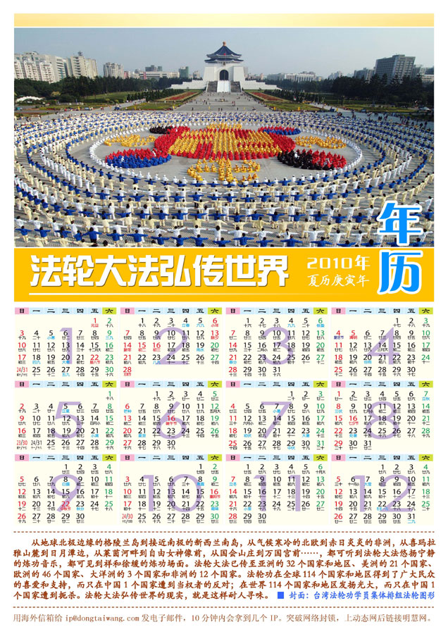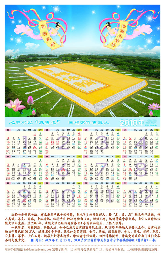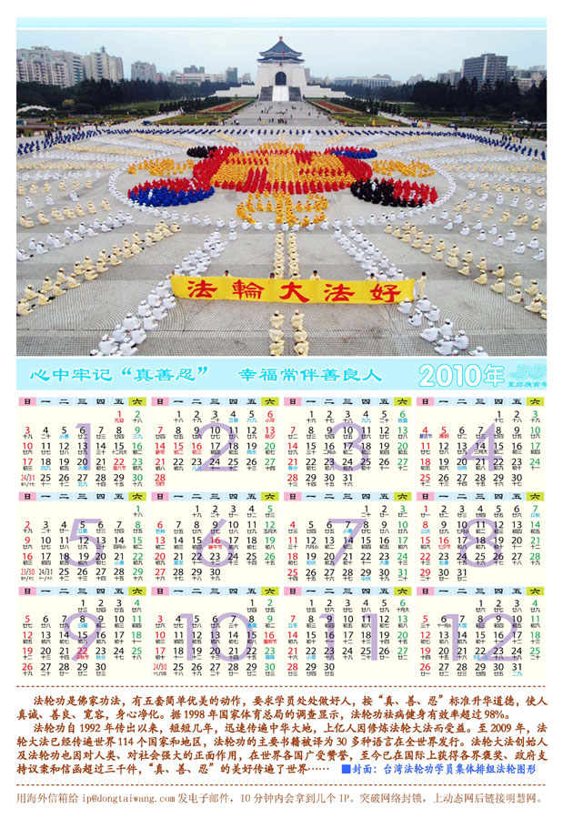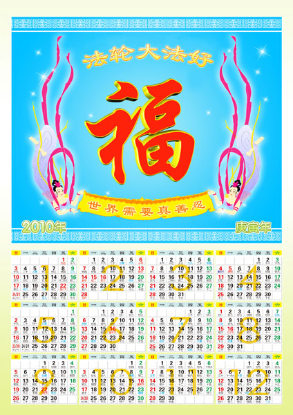 | 【明慧网二零零九年十二月十五日】 2010年年历:法轮大法弘传世界(单幅年历三款) 2010年年历:世界需要真善忍(单幅) 2010年年历:法轮大法弘传世界(单幅年历三款)