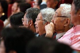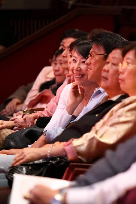 【明慧网二零零九年二月二十六日】(明慧记者王清汉、刘文新台湾台北报导)二零零九年二月二十五日晚上,美国神韵国际艺术团载着台南市连演六场爆满的气势,在台北市国际会议中心拉开帷幕。经济寒风中,神韵呈现的中国文化的神传艺术,打动了首都市民心灵的深处,深远的艺术内涵震撼了政府官员、艺术家、商业名流、医师以及法律、教育等各界人士;中华民国总统马英九特赠“美国神韵艺术团演出圆满成功”的花篮祝贺。演出中,掌声喝彩声,撼动了国际知名的台北市国际会议中心大厅。 观众被神韵精彩的节目吸引,乐在其中 |