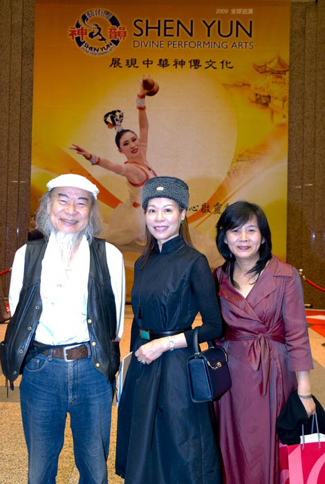 李瑞光表示演出非常精彩,尤其是彝族舞蹈《云罗仙韵》,“那些身穿五彩罗裙的舞蹈演员们,好象一朵朵盛开的花,每个姿态都很自然,好象不是人在跳,像是在大地间的神佛在表演。” 李瑞光不仅对天幕和舞台观察入微,对于每个舞蹈演员的肢体动作更有一番感受,他强调演出中男子有一种韧性,女子则有如行云流水一般,“男子是一种韧性的刚猛,就象是《金猴降妖》一戏中,沙僧和妖魔幻化的美女拉扯唐僧,那个拉扯的动作协调得很好,妖女在打斗中使劲,但是孙悟空有一个停顿的点,那个力量的平衡,非常有意思。” 李瑞光认为在舞蹈技巧和多媒体的烘托下,神韵的舞台艺术呈现一种刚柔并济的美,他赞赏说:“尤其是女舞蹈演员,源自于心灵信仰,一种发自内心的力量,相当感人。” 艺术中心董事长:我看到了一种精神 黄梅国际艺术中心董事长黄梅也是画家,她观赏了演出后表示:“我觉得看到的就是精神。”  黄梅国际艺术中心董事长黄梅(中)与朋友一起前来观赏神韵艺术团在台北首场演出 |