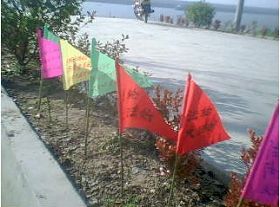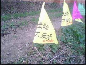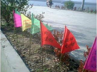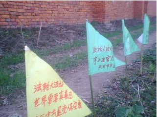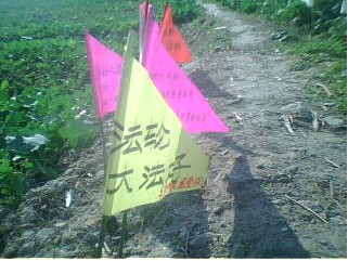 | 【明慧网二零零九年二月六日】新年是中国的传统节日,人们在新年期间都喜欢走亲访友,也是大法弟子讲真相的好时机。正月里,我到湖北某县农村去访友,见到沿途的道路两旁、田头地角、房前屋后插着很多色彩艳丽的小彩旗格外惹眼,给节日的农村增添许多喜庆的气氛。 走近一看原来是大法弟子的杰作。这些小彩旗上都是讲真相救度众生的标语,“法轮大法好”“世界需要真善忍”“退出中共保平安”。来来去去的人无不驻足观看。 这些小旗子制作非常简单,用普通蜡光彩纸裁成边长30—40厘米的三角形(见图,因为三角形不容易下垂和被风撕破),再用各种颜色的大记号笔写上各种真相标语,然后再用浆糊粘在小木棍或小竹棍上就行了。简单易做,效果明显。因没带相机,只能用手机拍了几张。我们觉得这种讲真相的方式值得借鉴,尤其适合在农村用来讲真相。