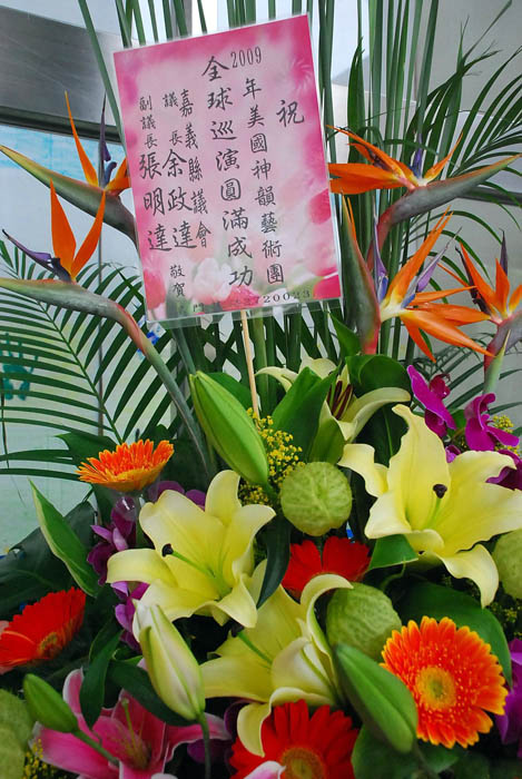 | 【明慧网二零零九年三月十一日】(明慧记者王清汉台湾嘉义报导)期待了一年的嘉义乡亲于二零零九年三月十日终于在国立中正大学礼堂,看到了神韵国际艺术团灿烂辉煌的舞台艺术,艺术团在嘉义的首演堪称大爆满,政要、医师、学术、艺术界人士拥入剧场,剧场内外观众热情澎湃,赞赏声不断,再次掀起神韵艺术热潮。 大礼堂前神韵旗帜迎风飘扬,堂前两旁摆满庆贺花篮,政要及地方人士为迎接神韵莅临嘉义,特别致赠花篮祝贺,有立法委员江义雄、嘉义县县长陈明文、嘉义市市长黄敏惠、民视创办人立法委员蔡同荣、嘉义县议会议长余政达、及副议长张明达、国立嘉义大学校长李明仁、大同技术学院校长简宣博、救国团嘉义团友会会长陈喜彦、嘉义县议员赖朝仑、民雄乡乡长陈福成、民雄乡民代表会主席何聪祺及副主席何元仪、嘉义市议会秘书长张志成等。  嘉义市市长致赠花篮祝贺 |