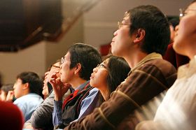 【明慧网二零零九年三月二日】(明慧记者沈容、王清汉台湾台北报导)二零零九年三月一日晚,神韵国际艺术团在台北市国际会议中心的演出,又一次绽放出璀璨的艺术火花,台北士林扶轮社理事王健表示,神韵是一台高水准的艺术演出,是值得政府提倡的文化创意产业。 台北观众专注观看神韵国际艺术团演出 |