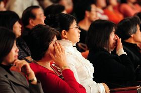 【明慧网二零零九年三月九日】(明慧记者黄宇生、夏昀台中报导)延续前六场座无虚席的气势,二零零九年三月八日星期日,神韵国际艺术团在台湾台中的演出持续受到民众热烈反响,吸引画家、艺术家、音乐家、企业家、将军、台中市文化局局长,及各界人士前来观赏神韵演出,他们当中有的是第二度前来,如文化局局长所言,神韵演出是有口碑的,他希望神韵明年、后年或更久的将来都能继续来台湾,和台湾热情的民众分享精心的演出。 受神韵演出感动的观众 |