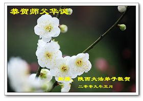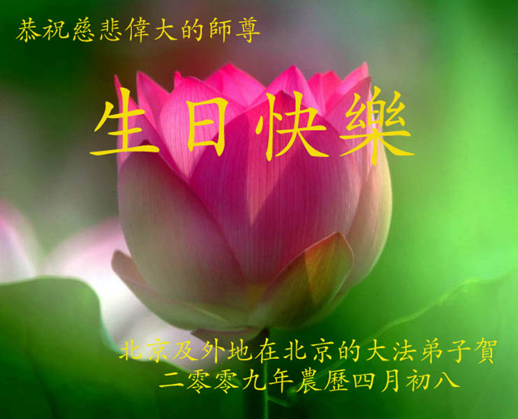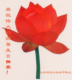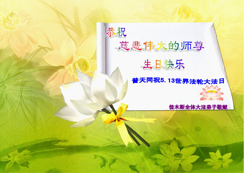 师尊真伟大, 慈悲传大法。 大法正天下, 洪福赐大家。 弟子听师话, 变化无限大。 救人表现好, 圆满好回家。 佳木斯大法弟子 2009年5月 佳木斯退休教师大法弟子恭祝伟大师尊生日快乐!