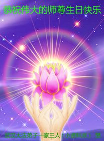 我们一定在最后有限的时间里,紧紧跟着师尊,走好正法最后的路,努力做好三件事,不辜负师尊的慈悲苦度!请师父放心!!! 赤峰大法弟子我们全家祝慈悲伟大的师尊生日快乐!