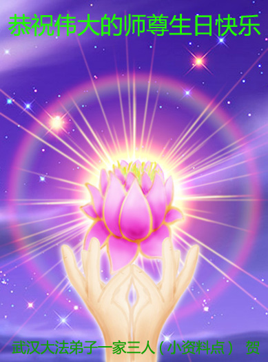 请师父放心,我们会学好法、向内找,整体提高,整体升华,做好三件事,圆满随师还! 武汉一家九位大法弟子敬祝伟大的师尊生日快乐!