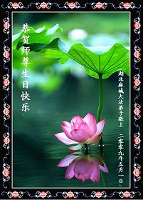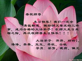 伟大慈悲师尊您好, 全体弟子向您合十, 恭祝师尊生日快乐, 感谢师尊救度恩。 末法末劫传大法, 拯救了宇宙苍穹, 救度了所有众生, 佛恩浩荡憾全宇。 我们能为您弟子, 助师正法世间行, 讲清真相救众生, 三件事情为己任。 师尊呵护众弟子, 圆满回升随师还, 弟子感谢救度恩, 精進精進再精進! 让伟大慈悲师尊多份欣慰少操心 学法组全体弟子恭祝伟大慈悲师尊生日快乐! 阿城学法组全体弟子敬上 成都大法弟子祝师尊生日快乐!
