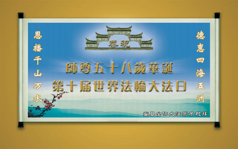 湖北省嘉鱼县鱼岳镇、新街镇、渡普镇、潘家湾镇、牌洲湾镇全体大法弟子恭祝师尊华诞快乐!恭祝大法洪传十七周年!恭贺世界法轮大法日十周年!