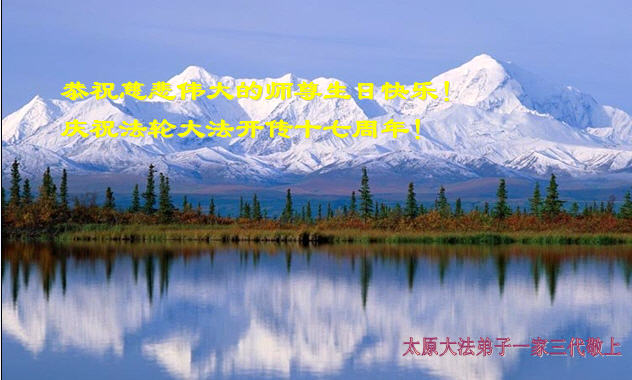太原大法弟子一家三代恭祝慈悲伟大的师尊生日快乐!庆祝法轮大法开传十七周年!