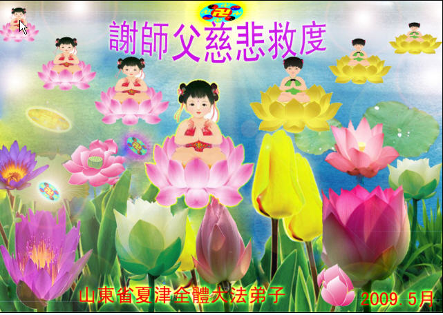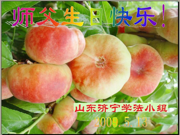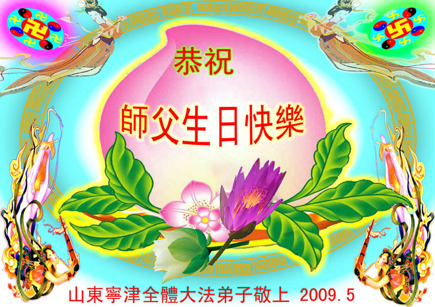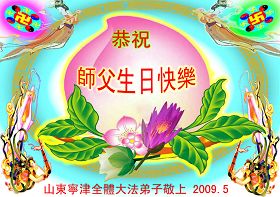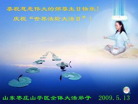 弟子们在新的一年里,不断总结修炼过程,抓紧实修,做好三件事,让师尊少一份操劳,多一份欣慰,谢谢师尊的慈悲苦度。 成都市郊县全体大法弟子叩拜 二零零九年五月八日 山东枣庄大法弟子祝师尊生日快乐!