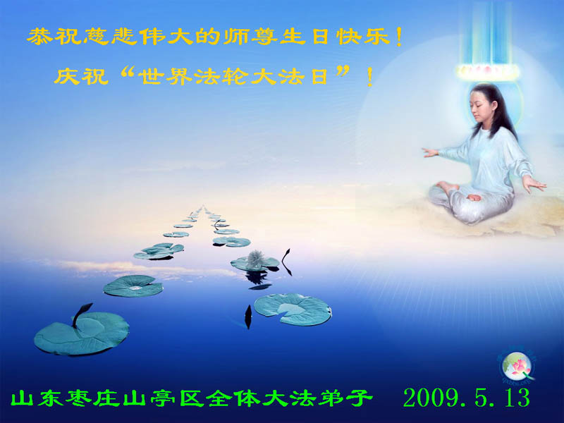 山东省枣庄市山亭区全体大法弟子恭祝慈悲伟大的师尊生日快乐!庆祝第十个“世界法轮大法日”!