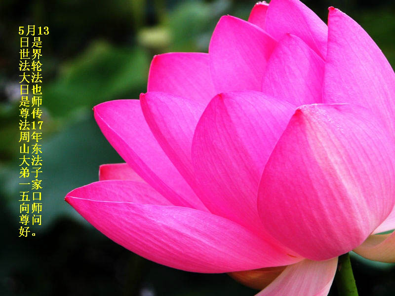 涿州大法弟子恭祝师尊华诞暨法轮大法洪传十七周年 师尊亲临大穹宇 为救众生把法正 旧势乱神来阻挡 丑态百出妖戏尽 弟子谨遵师父令 修心性来向内找 时时处处把法正 眼看大戏将落幕 慈悲撒满天地春 芸芸众生大法度 感恩我主大慈悲 佛恩浩荡悠悠在 新宇苍穹满天辉 跪拜师尊生日好 灭尽邪恶随师归 涿州大法弟子恭祝师尊生日快乐! 2009年5月8日 吉林省红石林业局全体大法弟子恭祝慈悲伟大的师父生日快乐!祝贺法轮大法洪传十七周年暨世界法轮大法日!