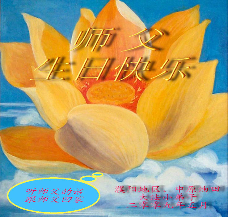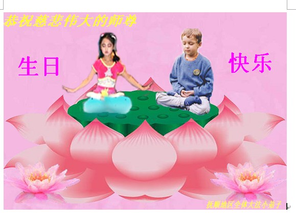 【明慧网二零零九年五月十三日】汤原八岁大法小弟子祝师父生日快乐!请师父放心,大法小弟子一定会精進,一定会把握心性。祝师父生日快乐! 汤原八岁大法小弟子 子怡 2009年4月28日 濮阳地区、中原油田大法小弟子恭祝师父生日快乐!